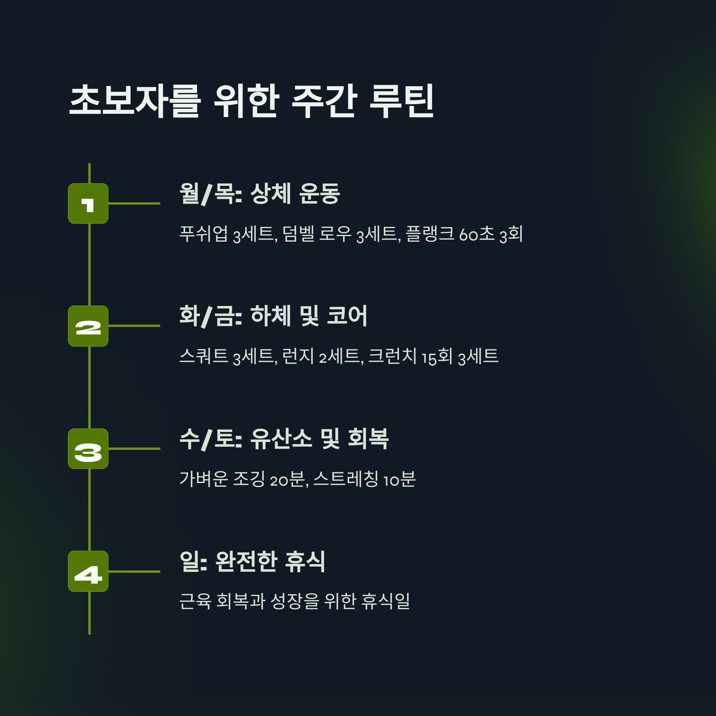 맨몸 운동 루틴은 전신을 고르게 자극할 수 있도록 구성하는 것이 중요합니다. 초보자의 경우 월수금은 상체, 화목토는 하체 및 코어 중심의 루틴으로 운영하면 효과적입니다. 각 부위별 운동은 푸쉬업, 플랭크, 마운틴클라이머, 스쿼트, 브릿지 등을 활용하고, 세트 수는 3~4세트, 반복은 10~15회로 시작하는 것이 좋습니다. 가장 중요한 것은 꾸준함과 올바른 자세를 유지하는 것입니다.