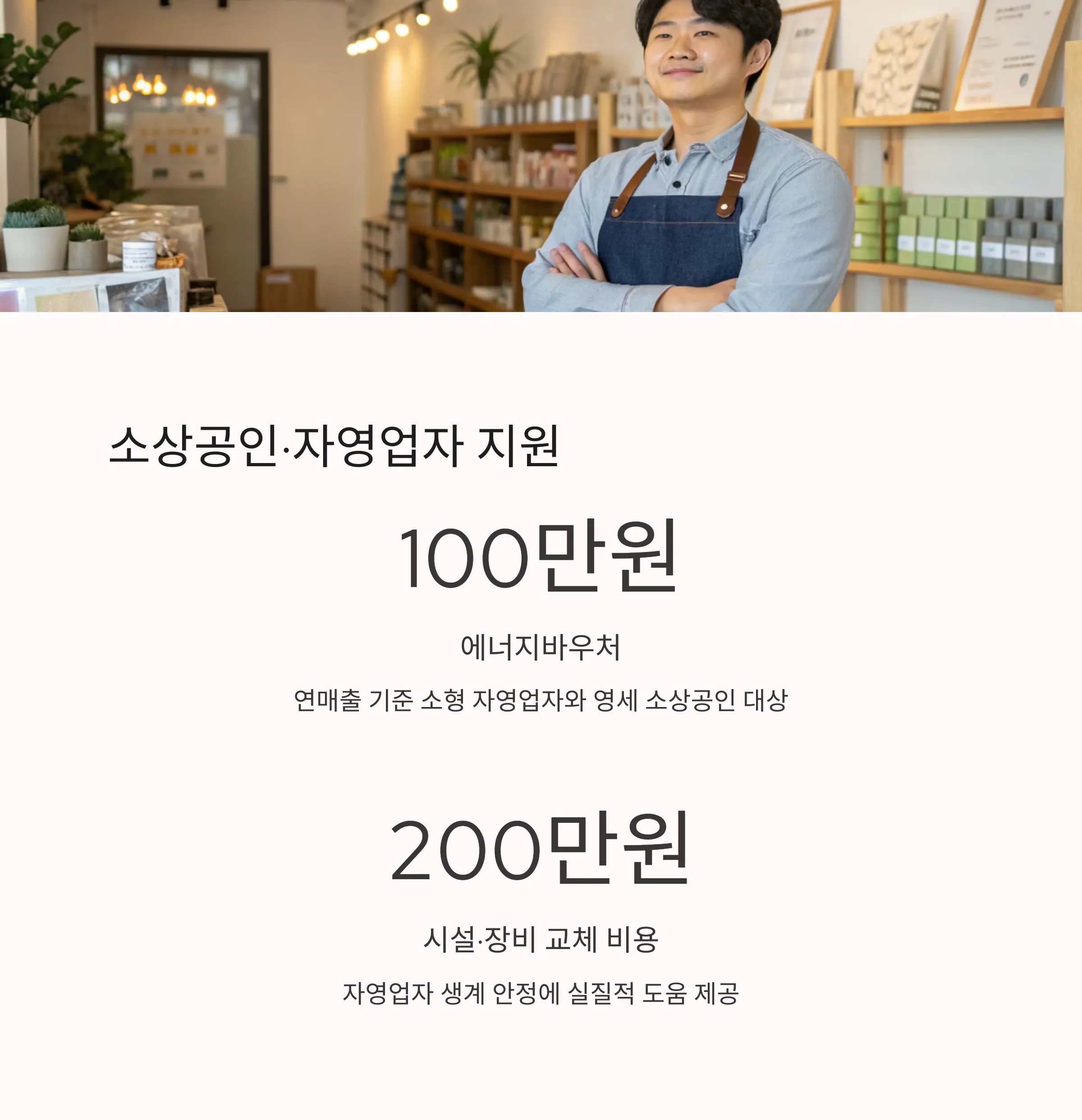 연매출 기준 소형 자영업자와 영세 소상공인에게 에너지바우처 100만 원, 시설·장비 교체 비용 최대 200만 원이 지원됩니다. 전국 정부지원금 종류 중 자영업자 생계 안정에 실질적 도움을 줍니다