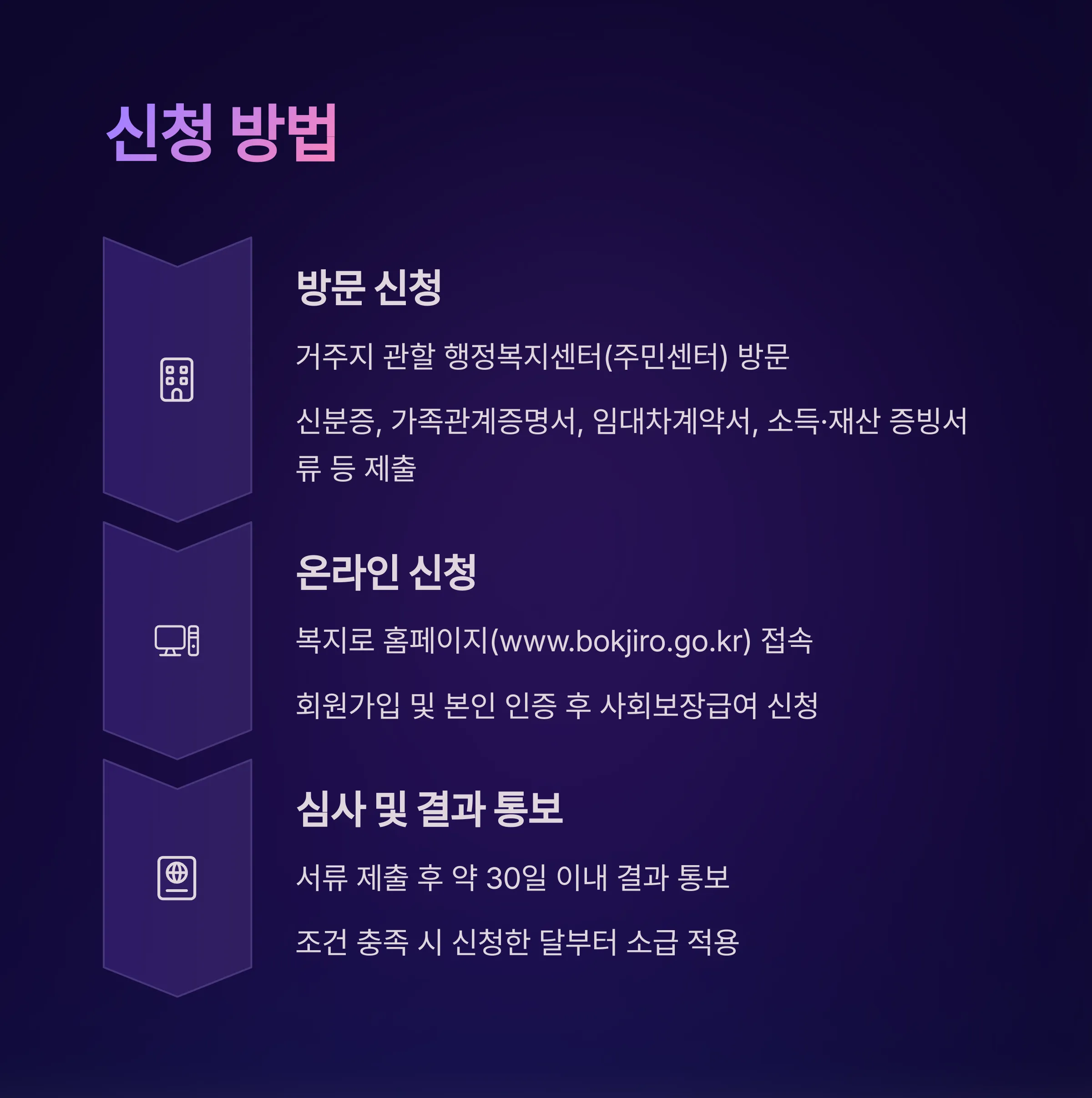- 노인, 한부모, 장애인 단독가구는 자녀나 부모의 소득과 무관하게 신청 가능