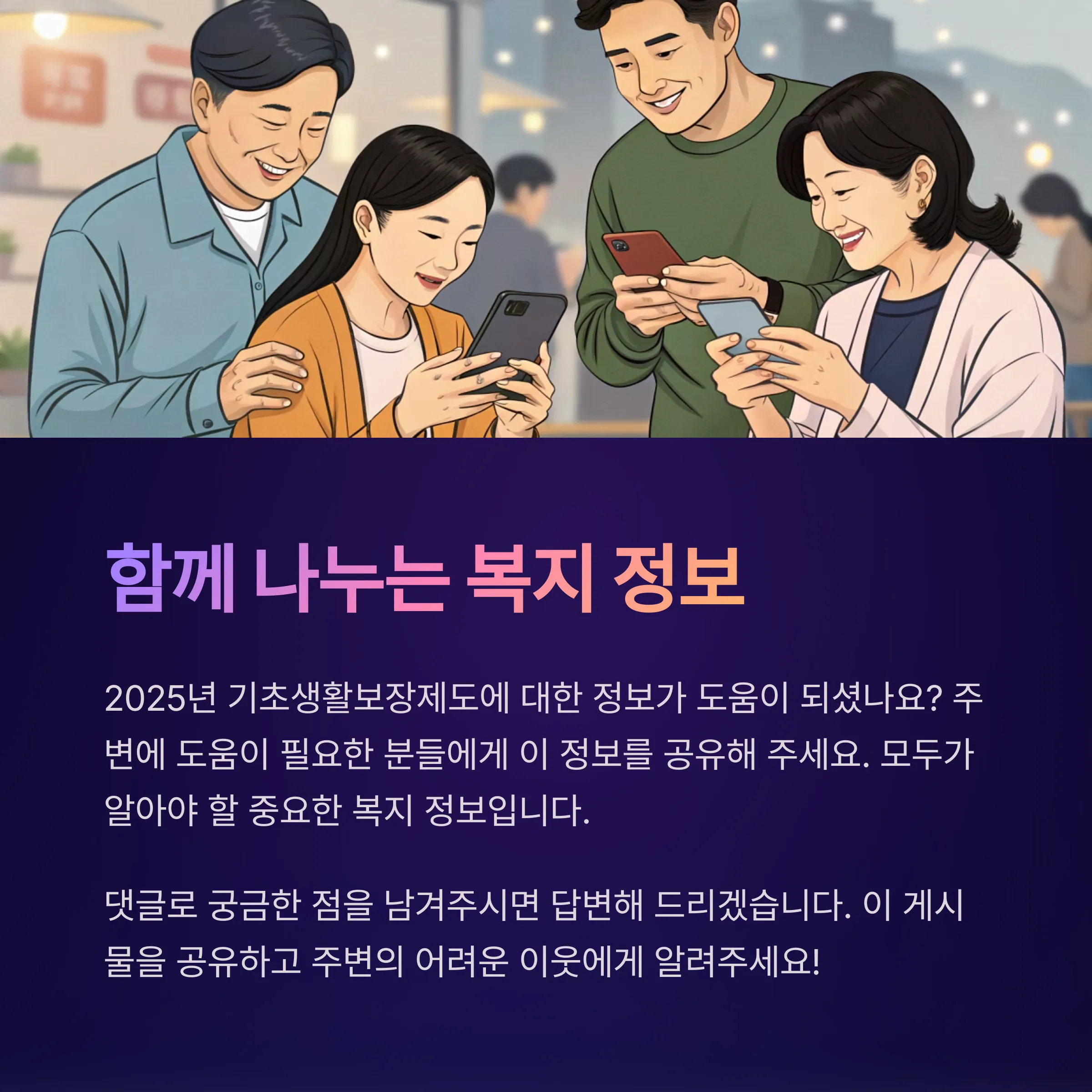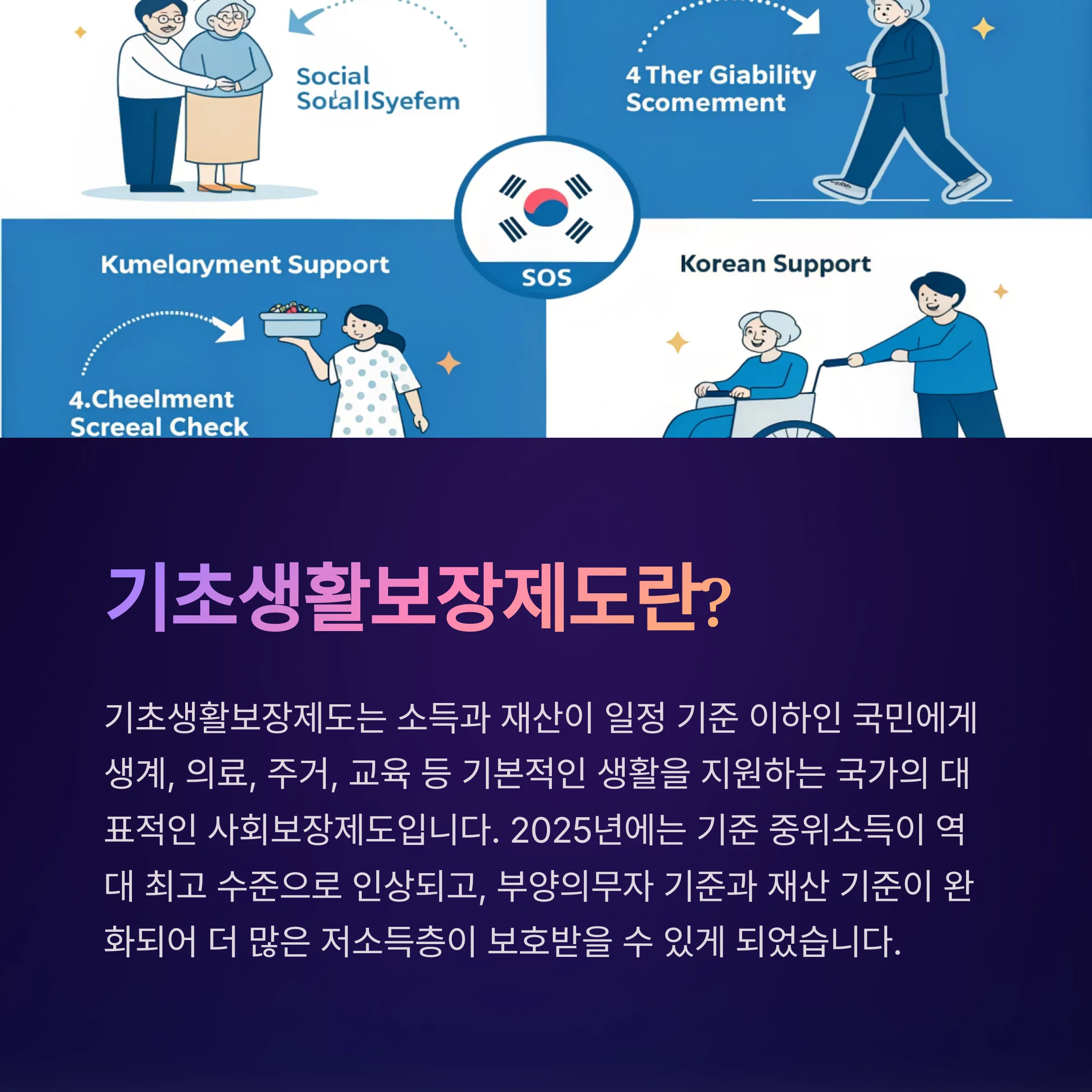 2025년 기초생활보장제도는 한층 강화된 기준과 확대된 지원으로 저소득층의 든든한 버팀목이 되고 있습니다. 자격이 되는 분들은 꼭 신청하셔서 경제적 안정을 되찾으시길 바랍니다.