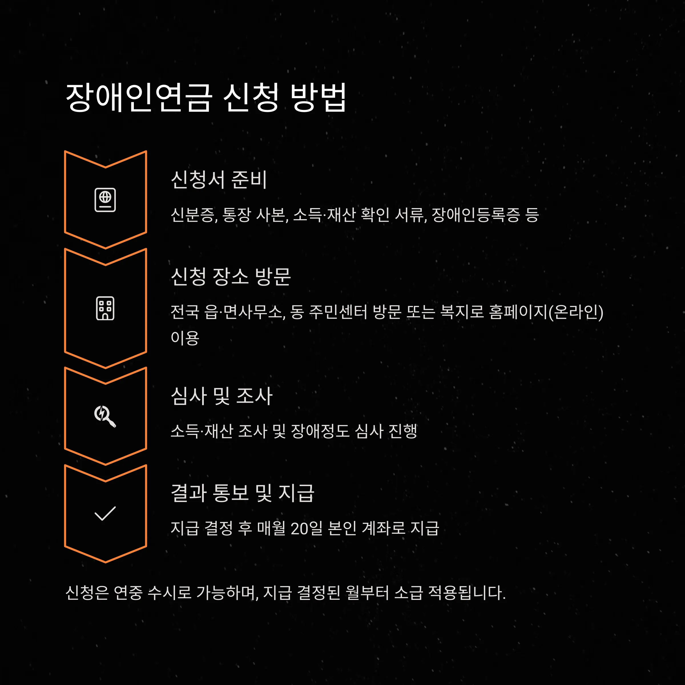 • 필요 서류: 신분증, 통장 사본, 소득·재산 확인 서류, 장애인등록증 등