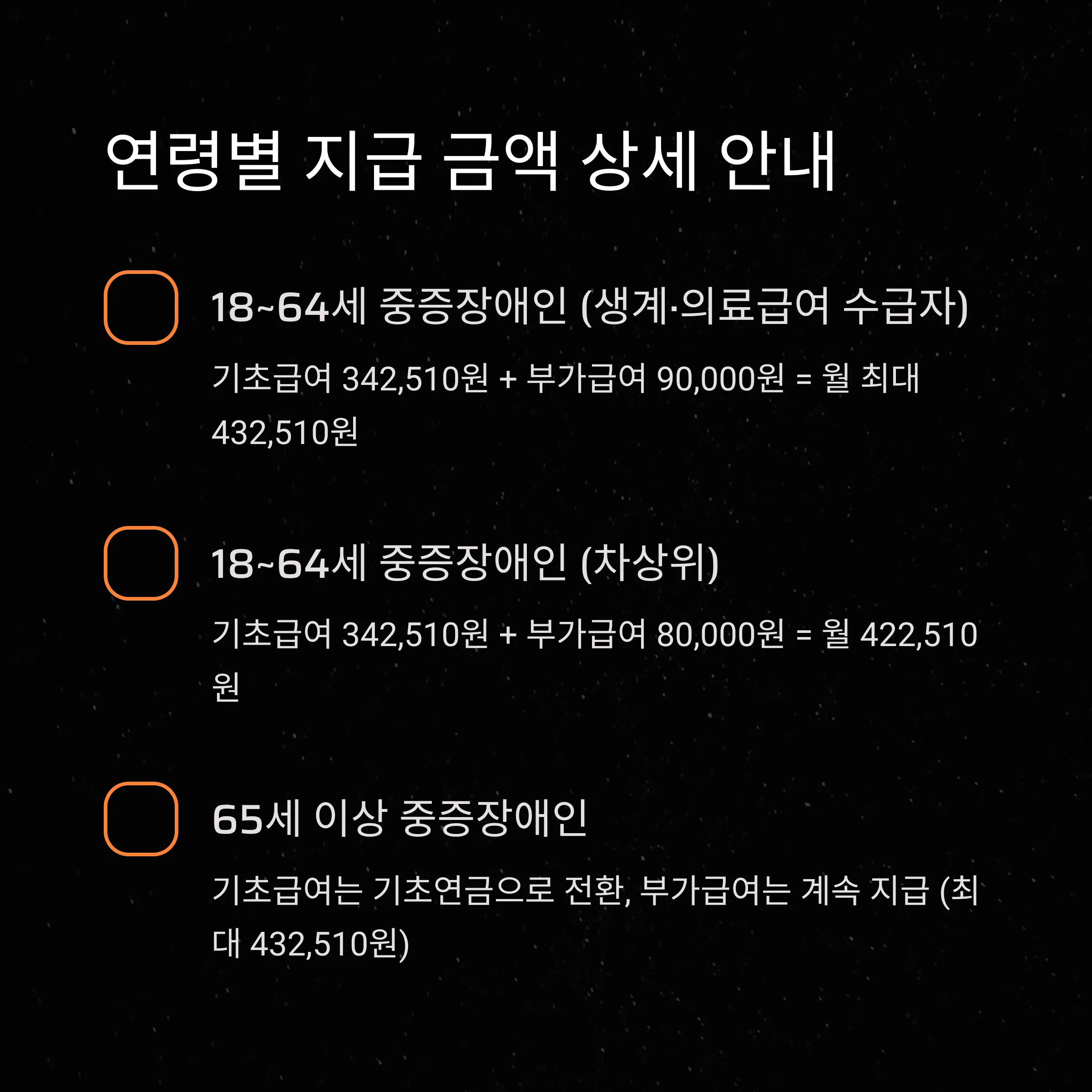 • 주거·교육급여 수급자 및 차상위: 기초급여 342,510원 + 부가급여 80,000원 = 월 422,510원