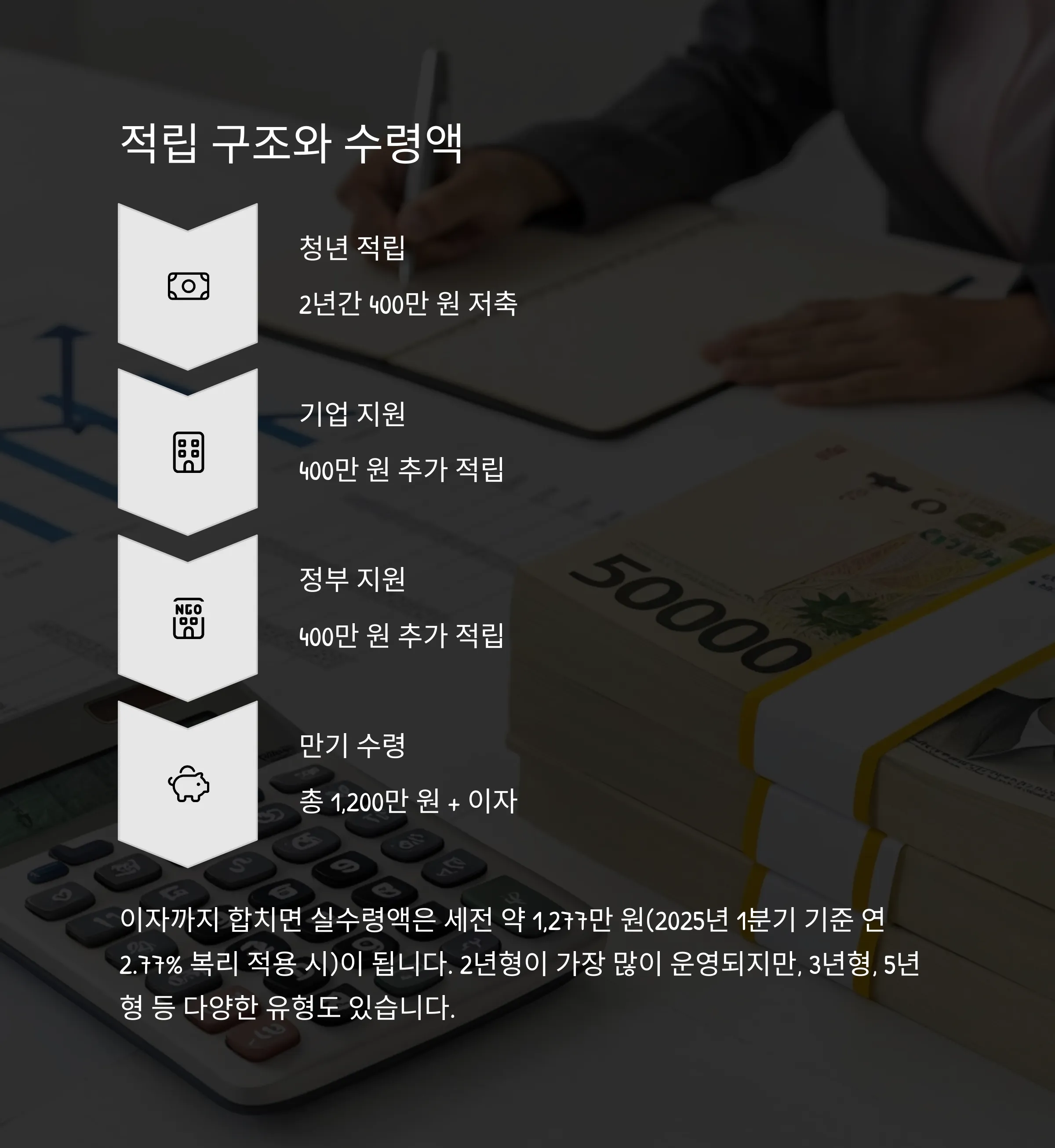 • 2년형 기준: 청년이 2년간 400만 원(월 16만 원 × 20개월, 월 20만 원 × 4개월)을 저축하면, 기업과 정부가 각각 400만 원씩 추가 적립해 만기 시 총 1,200만 원(이자 별도) 수령 가능