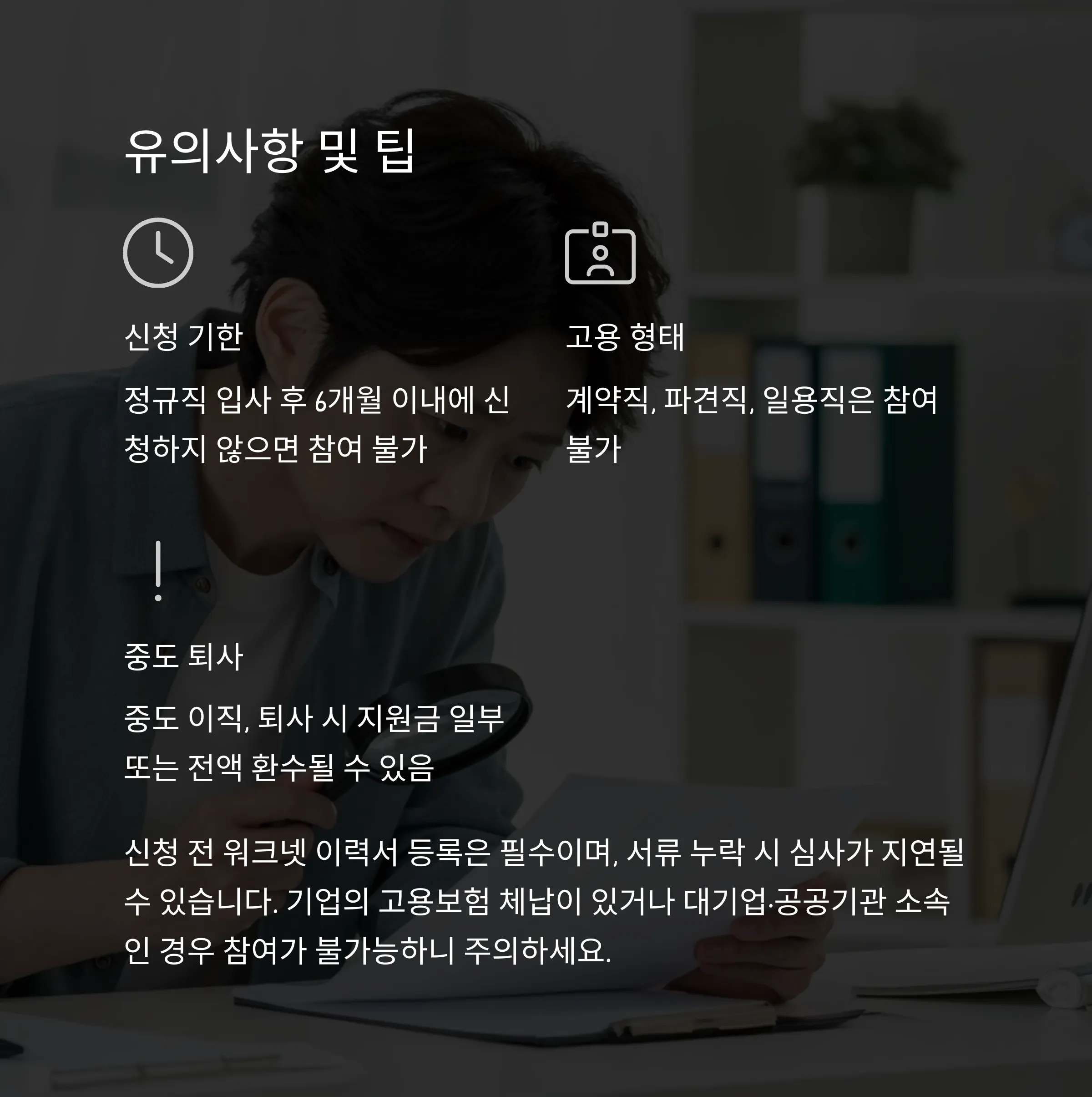 - 신청 전 워크넷 이력서 등록 필수, 서류 누락 시 심사 지연 가능
