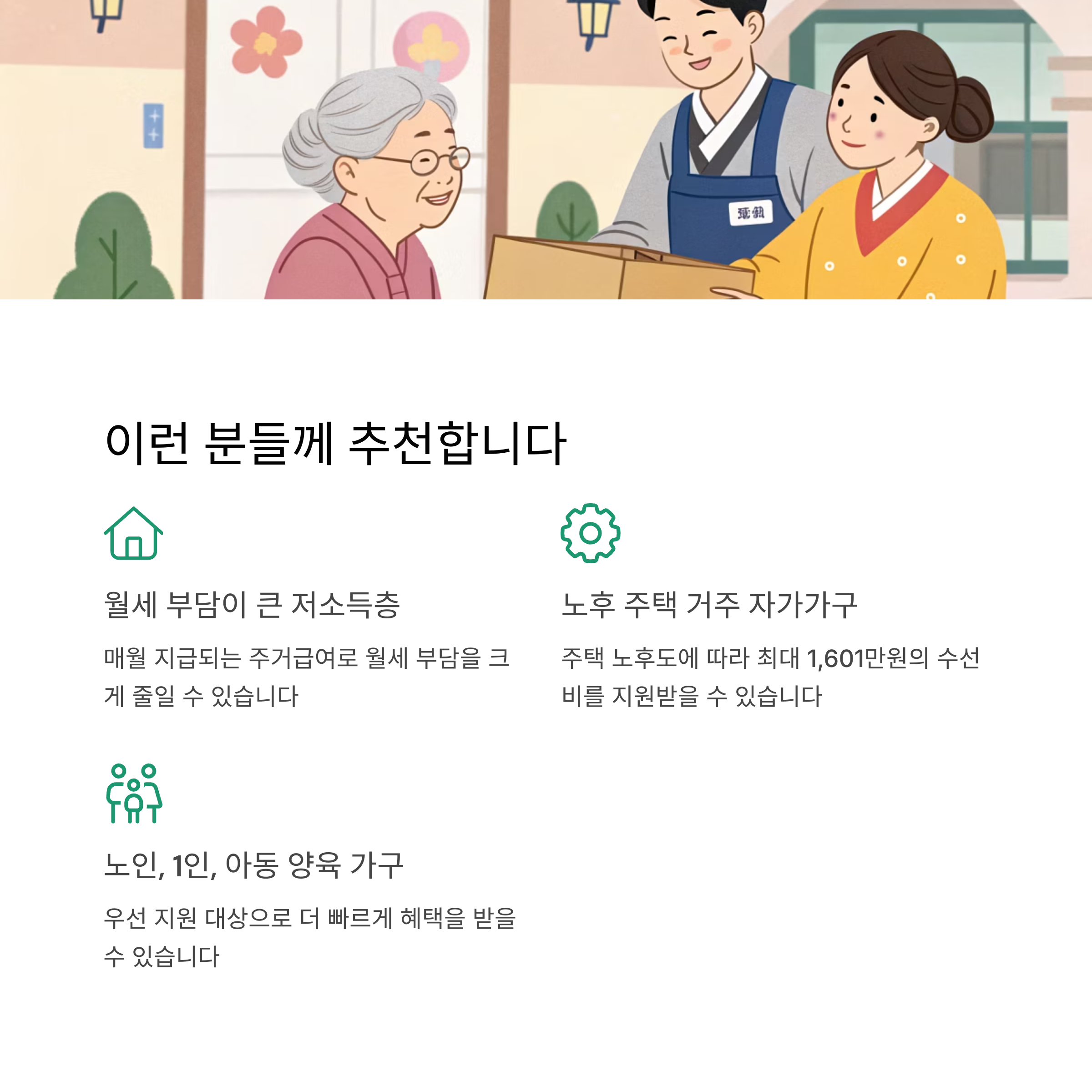 - 지원유형: 임차가구(월세 지원), 자가가구(주택 수선비 지원)