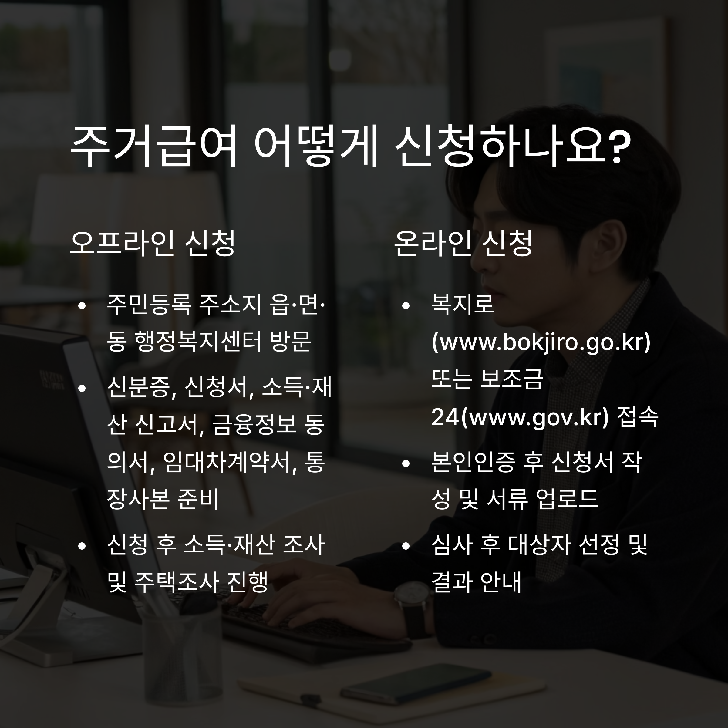 주거급여는 온라인과 오프라인 모두 신청할 수 있습니다.