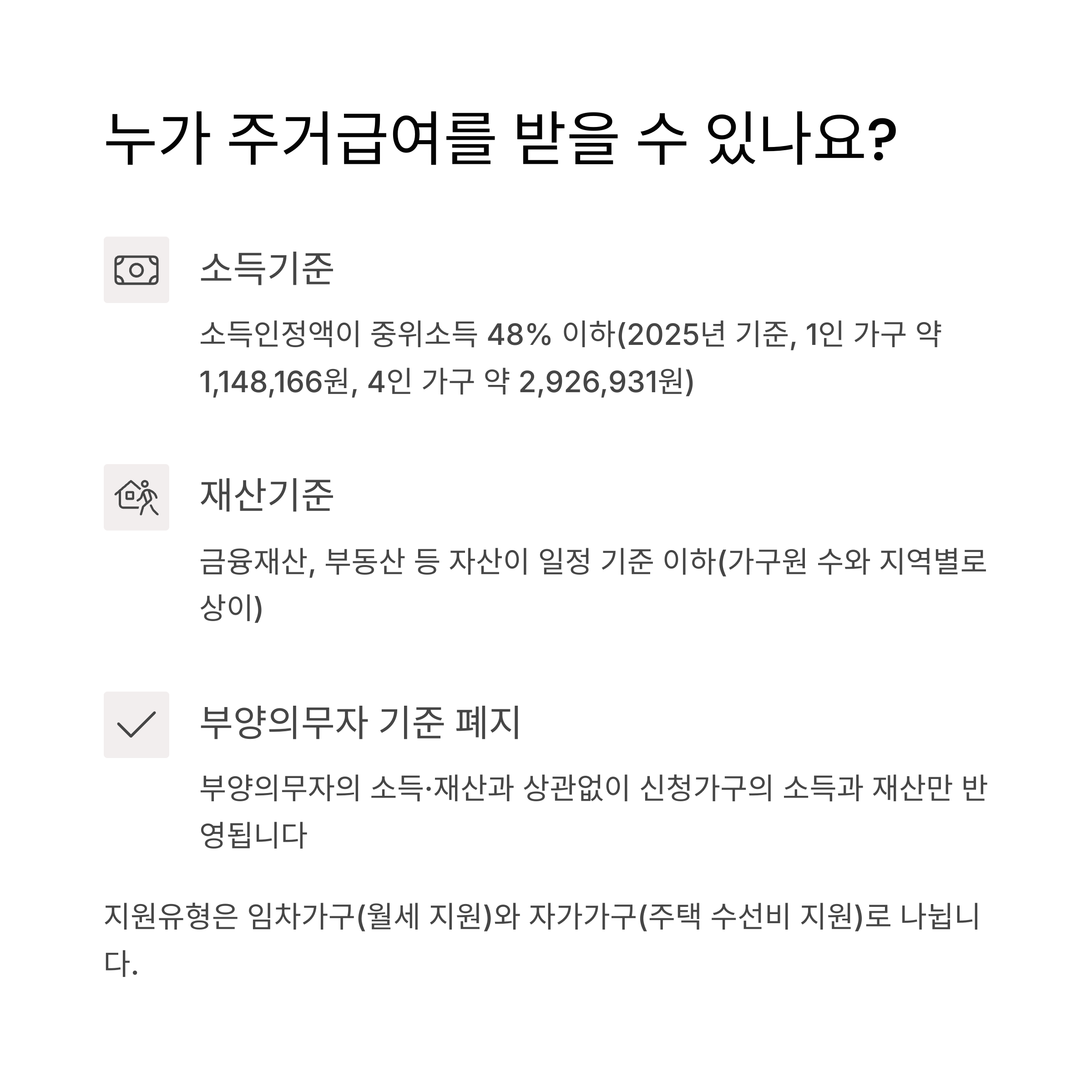 주거급여는 소득과 재산 조건을 충족하는 가구에게 제공됩니다. 2025년 기준 주요 조건은 다음과 같습니다.