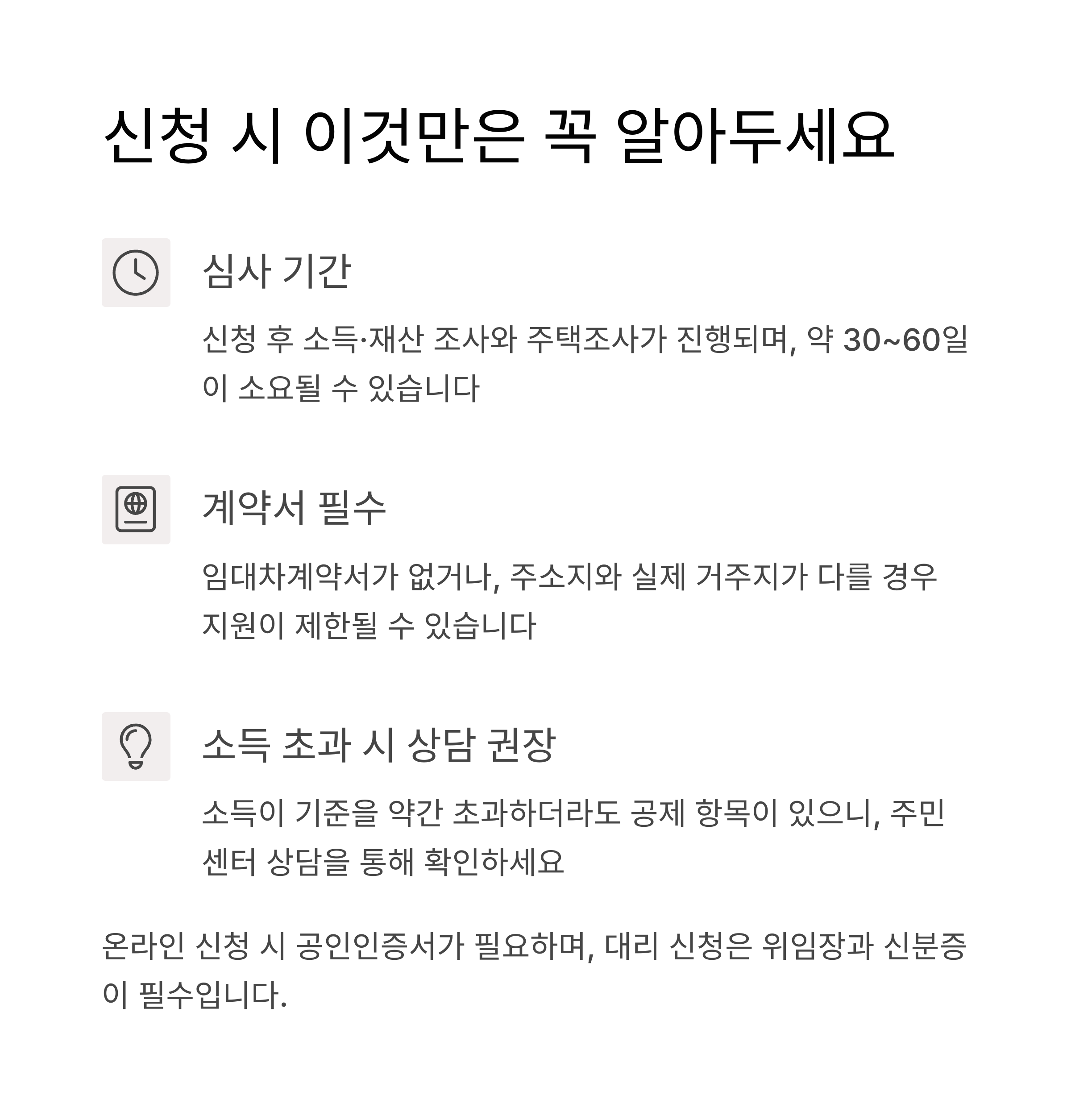 - 신청 후 소득·재산 조사와 주택조사가 진행되며, 심사에 약 30~60일 소요될 수 있습니다.