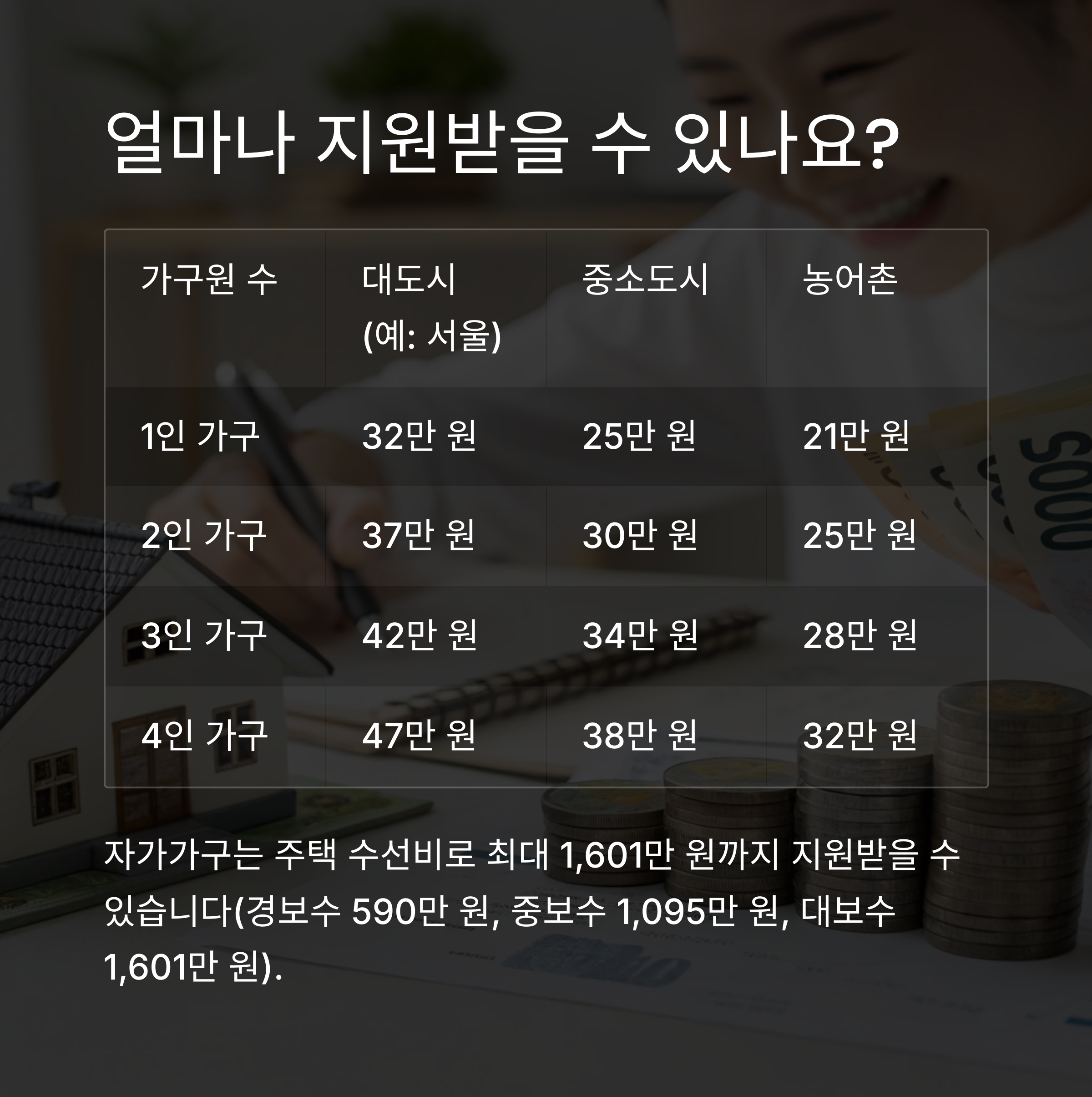 이 외에도 자가가구는 주택 수선비로 최대 1,601만 원까지 지원받을 수 있습니다(경보수 590만 원, 중보수 1,095만 원, 대보수 1,601만 원).