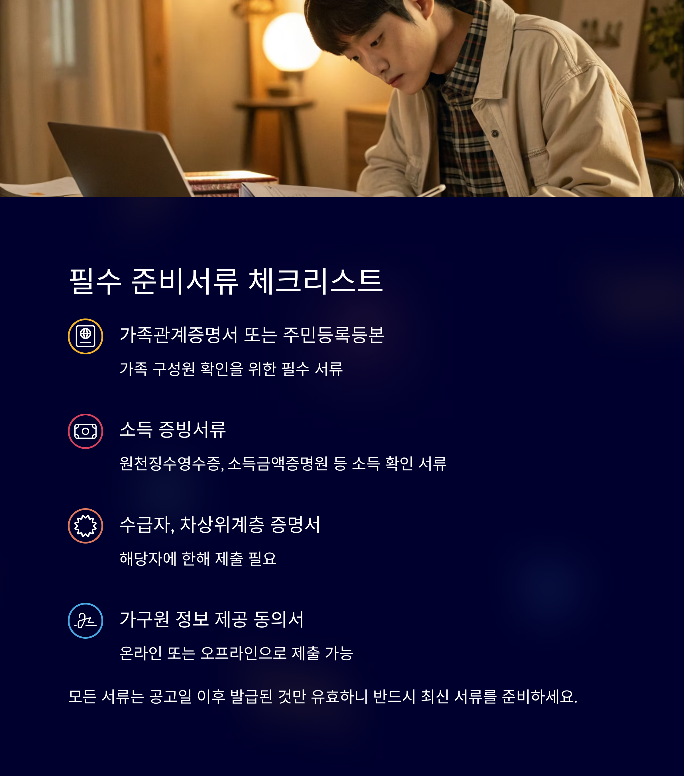 - 서류 제출 및 가구원 정보 제공 동의: 가족관계증명서, 소득증빙서류 등 필수