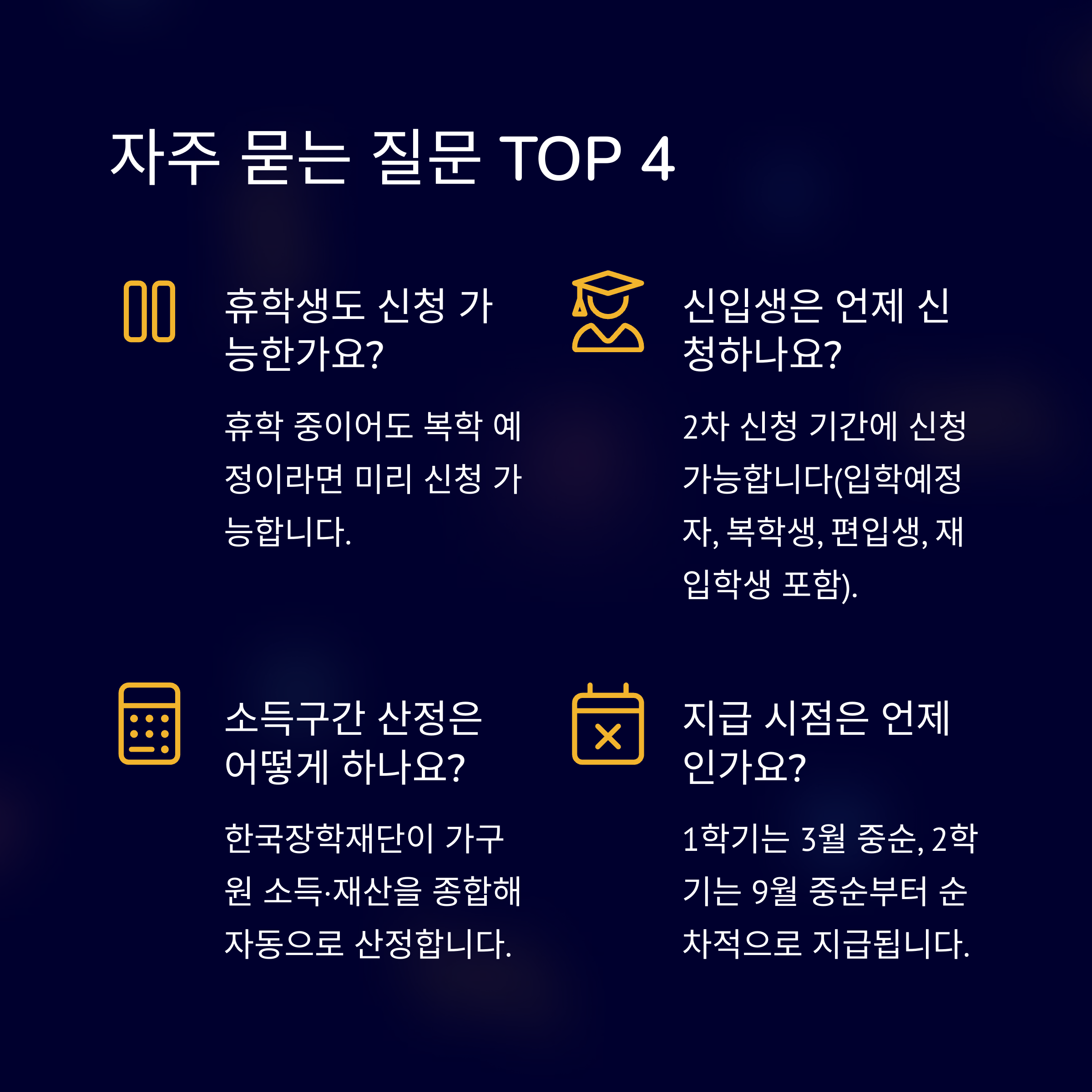 - 지급 금액은 등록금 범위 내에서만 지급되며, 초과 시 반환.
