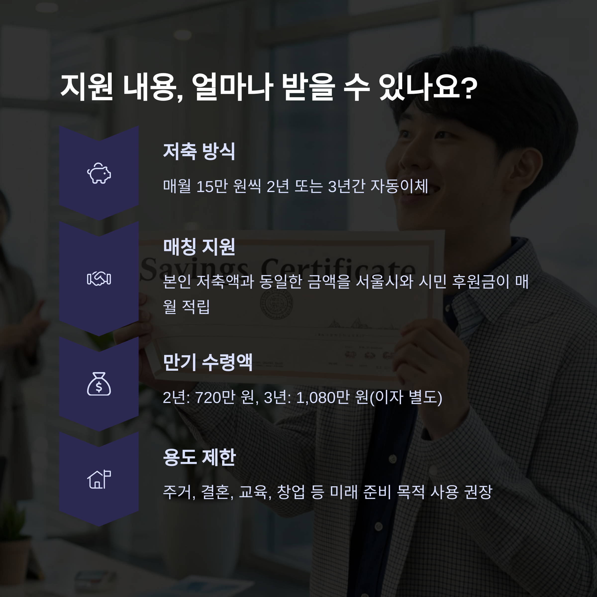 - 매칭 지원: 본인 저축액과 동일한 금액을 서울시와 시민 후원금이 매월 적립
