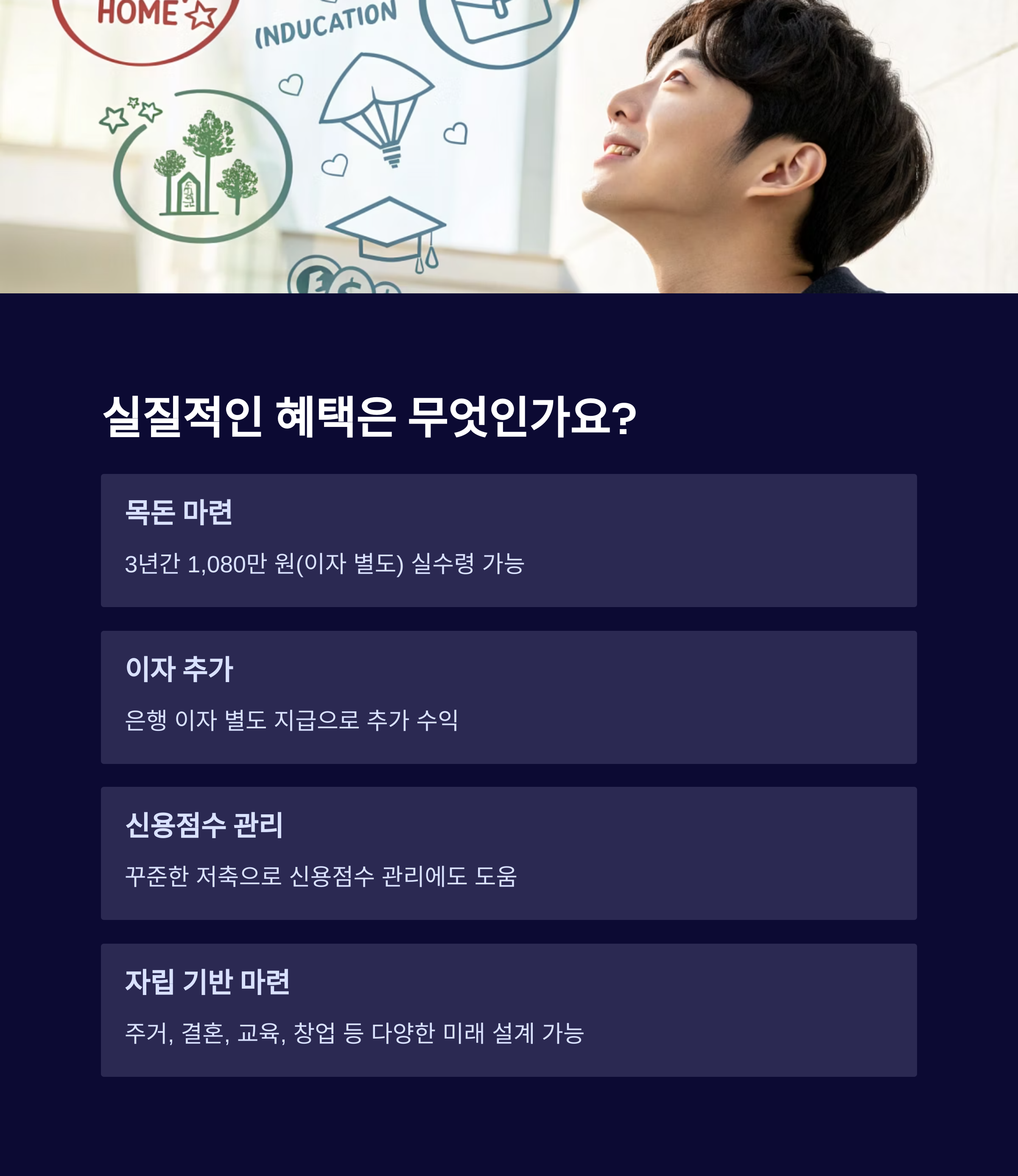 - 자립 기반 마련: 주거, 결혼, 교육, 창업 등 다양한 미래 설계 가능