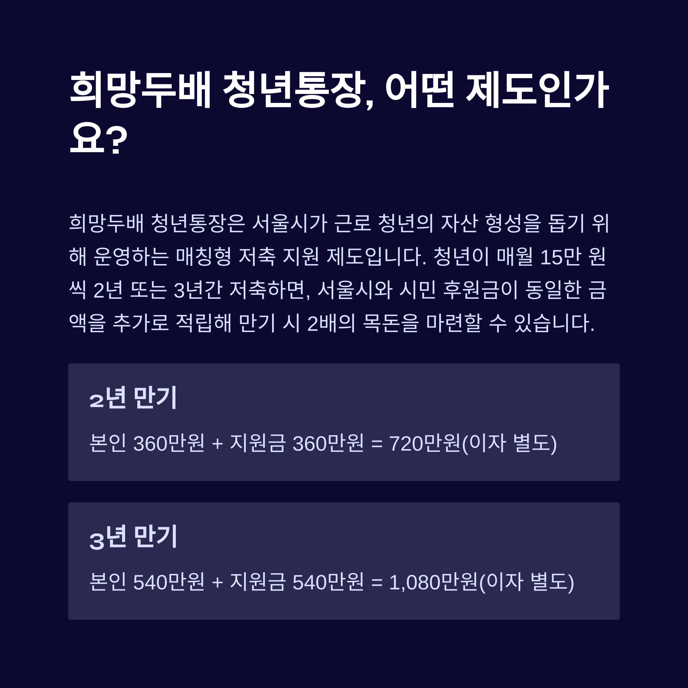 희망두배 청년통장은 서울시가 근로 청년의 자산 형성을 돕기 위해 운영하는 매칭형 저축 지원 제도입니다. 청년이 매월 15만 원씩 2년 또는 3년간 저축하면, 서울시와 시민 후원금이 동일한 금액을 추가로 적립해 만기 시 2배의 목돈을 마련할 수 있습니다. 2025년 기준, 2년 만기 시 720만 원, 3년 만기 시 1,080만 원(이자 별도)의 자산을 만들 수 있습니다.
