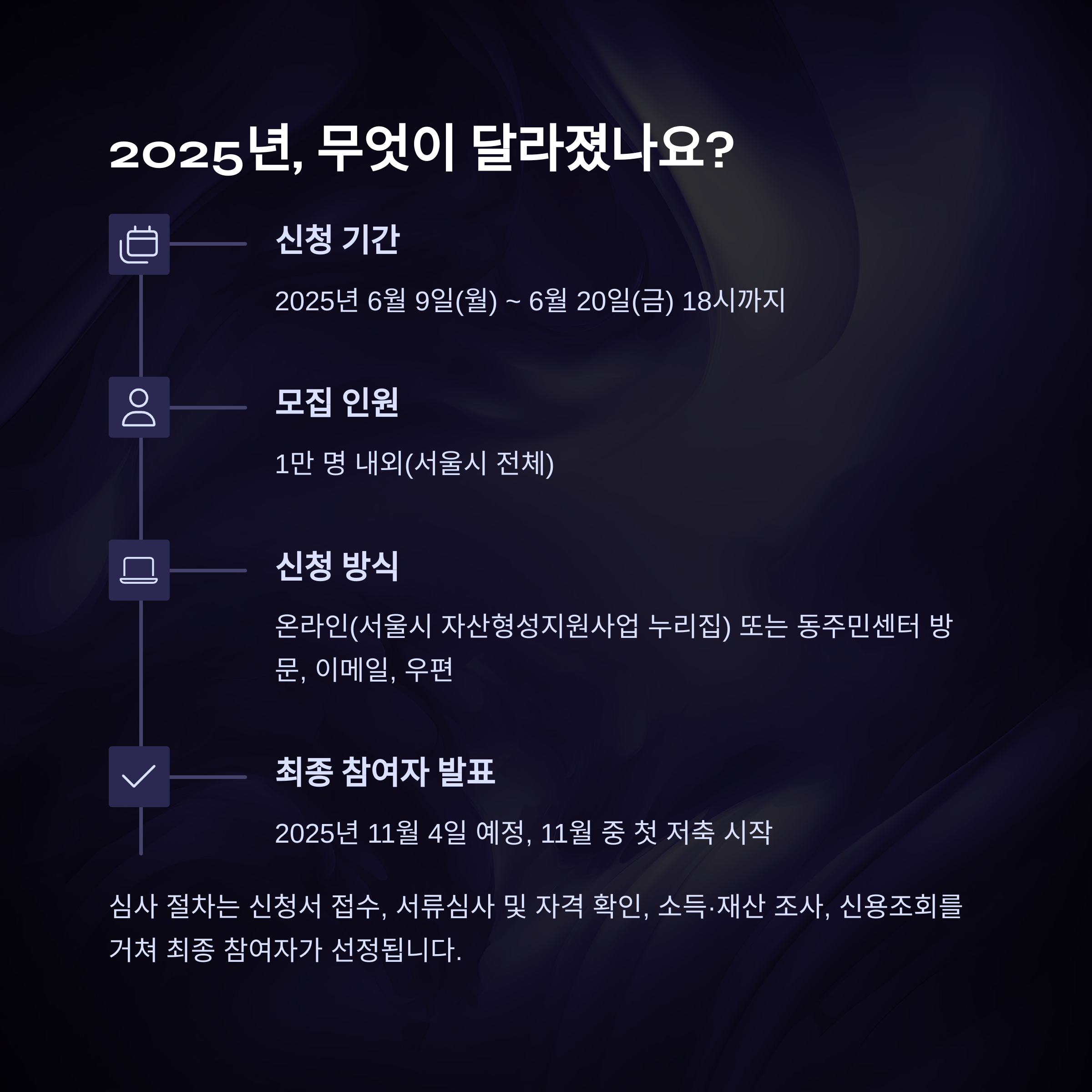 - 신청 방식: 온라인(서울시 자산형성지원사업 누리집) 또는 동주민센터 방문, 이메일, 우편