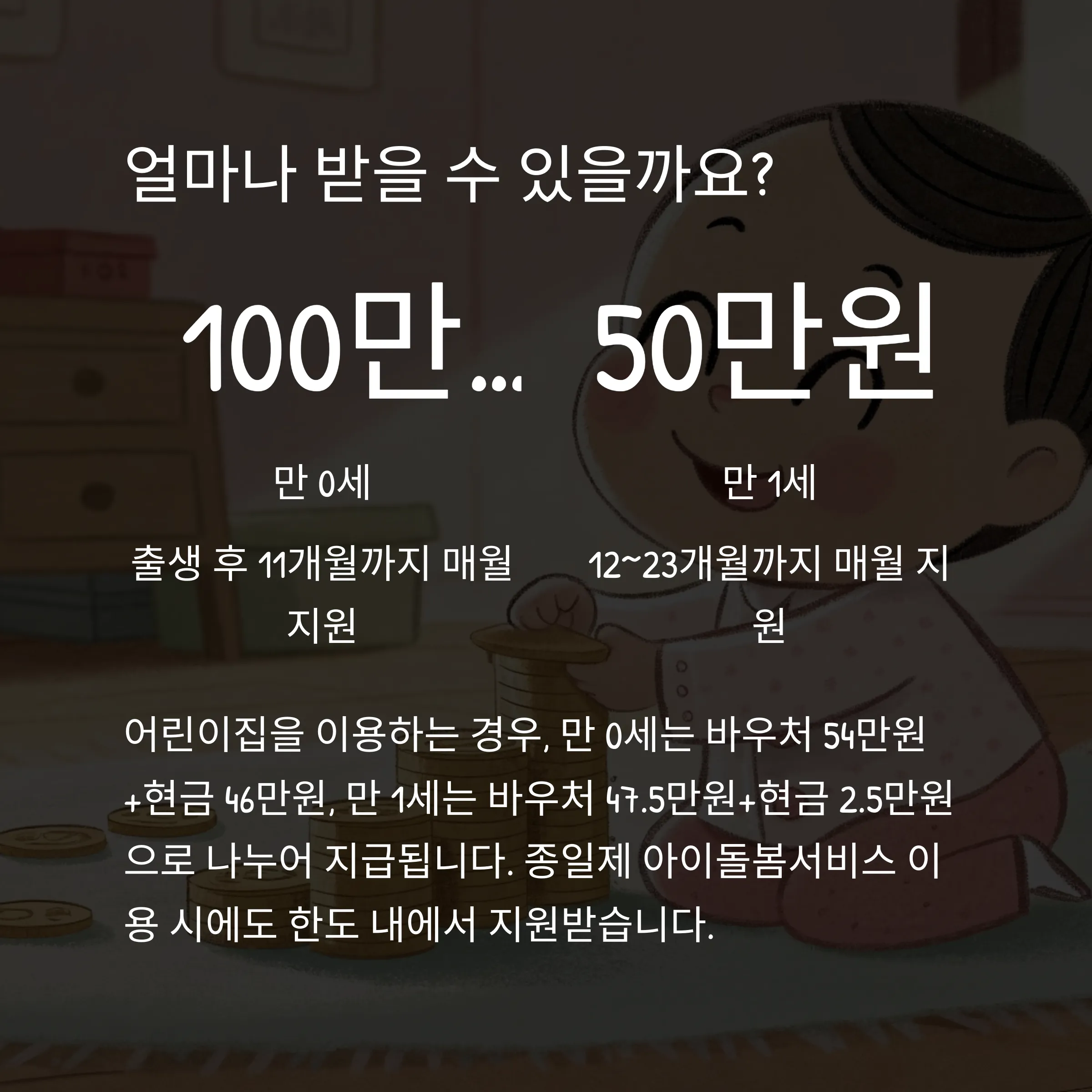| 만 0세 (0~11개월) | 1,000,000원 | 바우처 540,000원 + 현금 460,000원 |