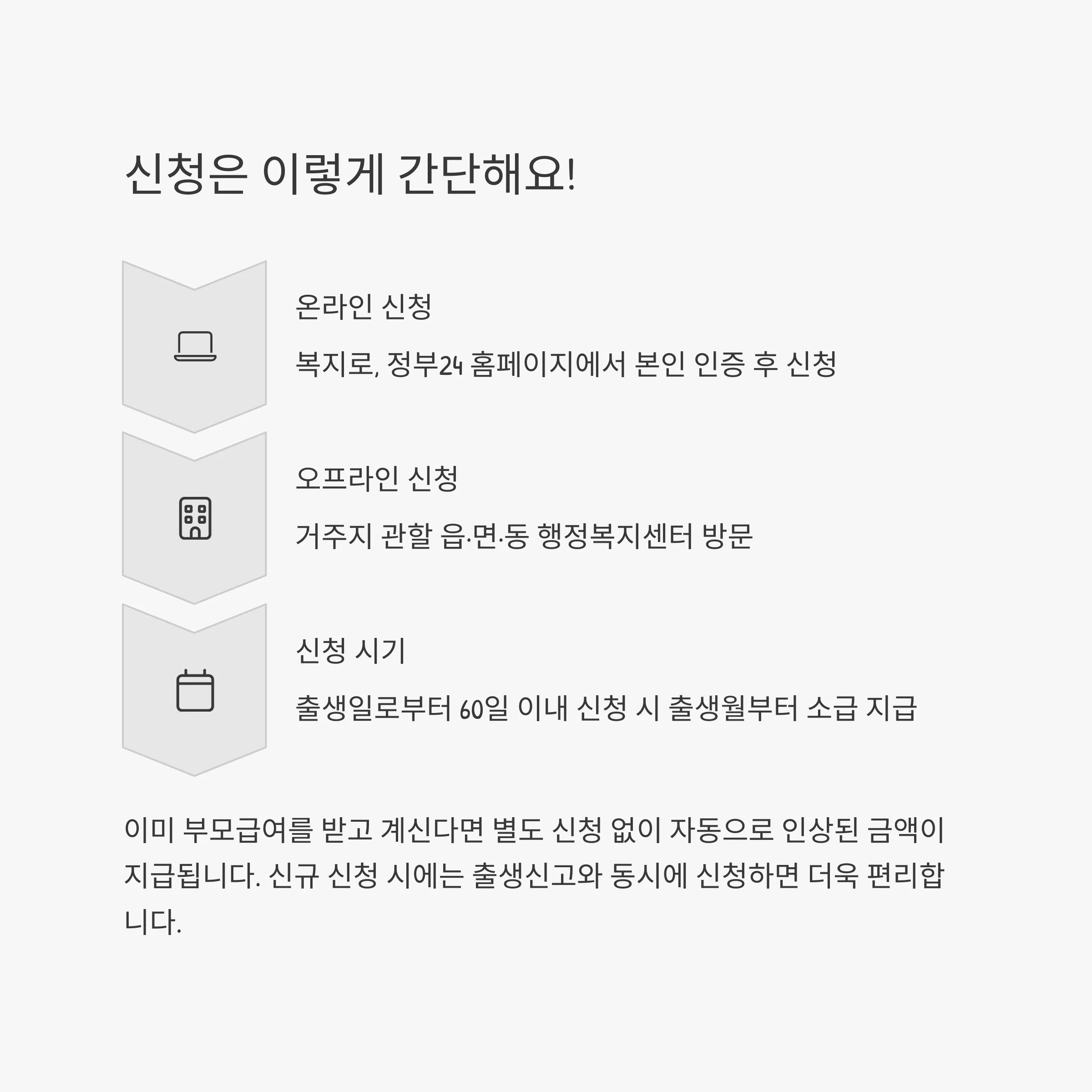 부모급여 확대 신청은 매우 간단합니다. 이미 부모급여를 받고 있다면 별도 신청 없이 자동으로 인상된 금액이 지급됩니다. 신규 신청자는 아래 방법을 참고하세요.