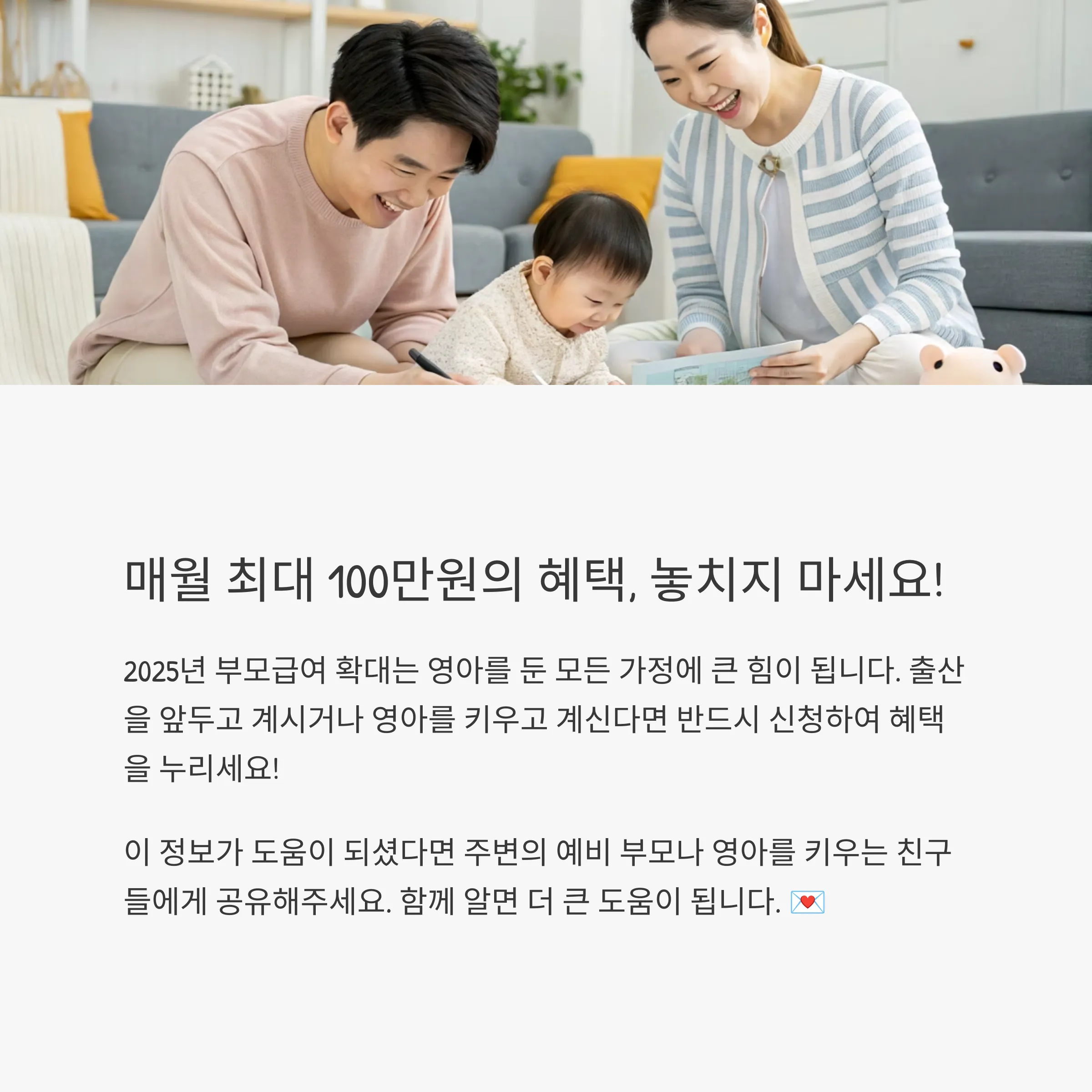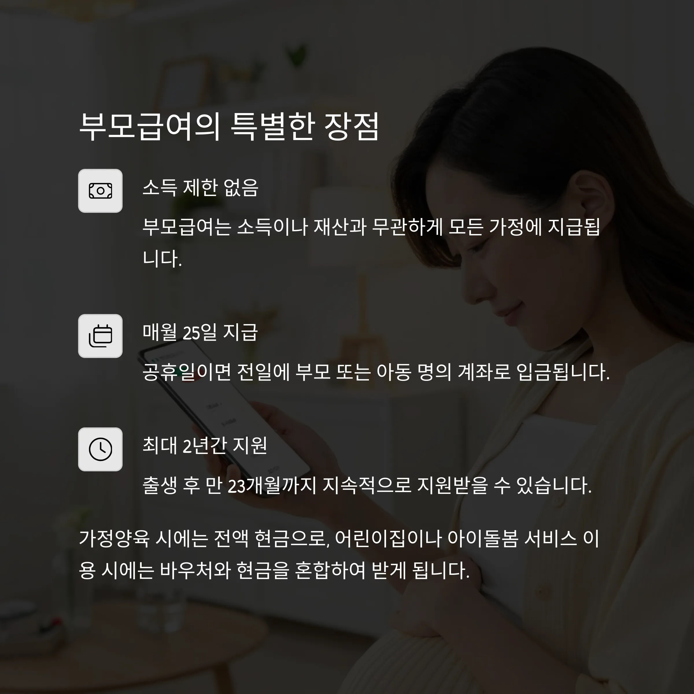 - 소득 기준 없음: 부모급여 확대는 소득이나 재산과 무관하게 모든 가정에 지급됩니다.