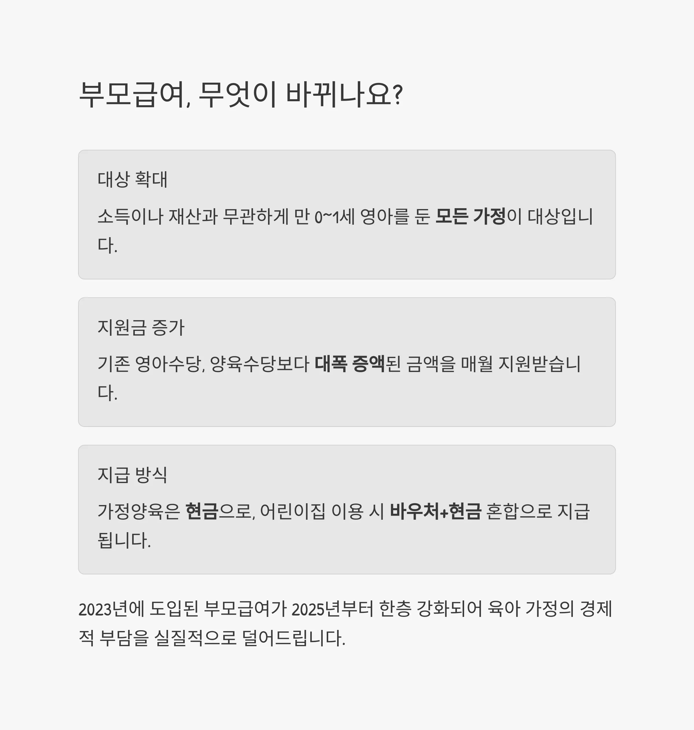- 부모급여 확대 정책에 따라, 만 0세 아동을 직접 양육하는 경우 매월 100만 원을 현금으로 받을 수 있습니다.