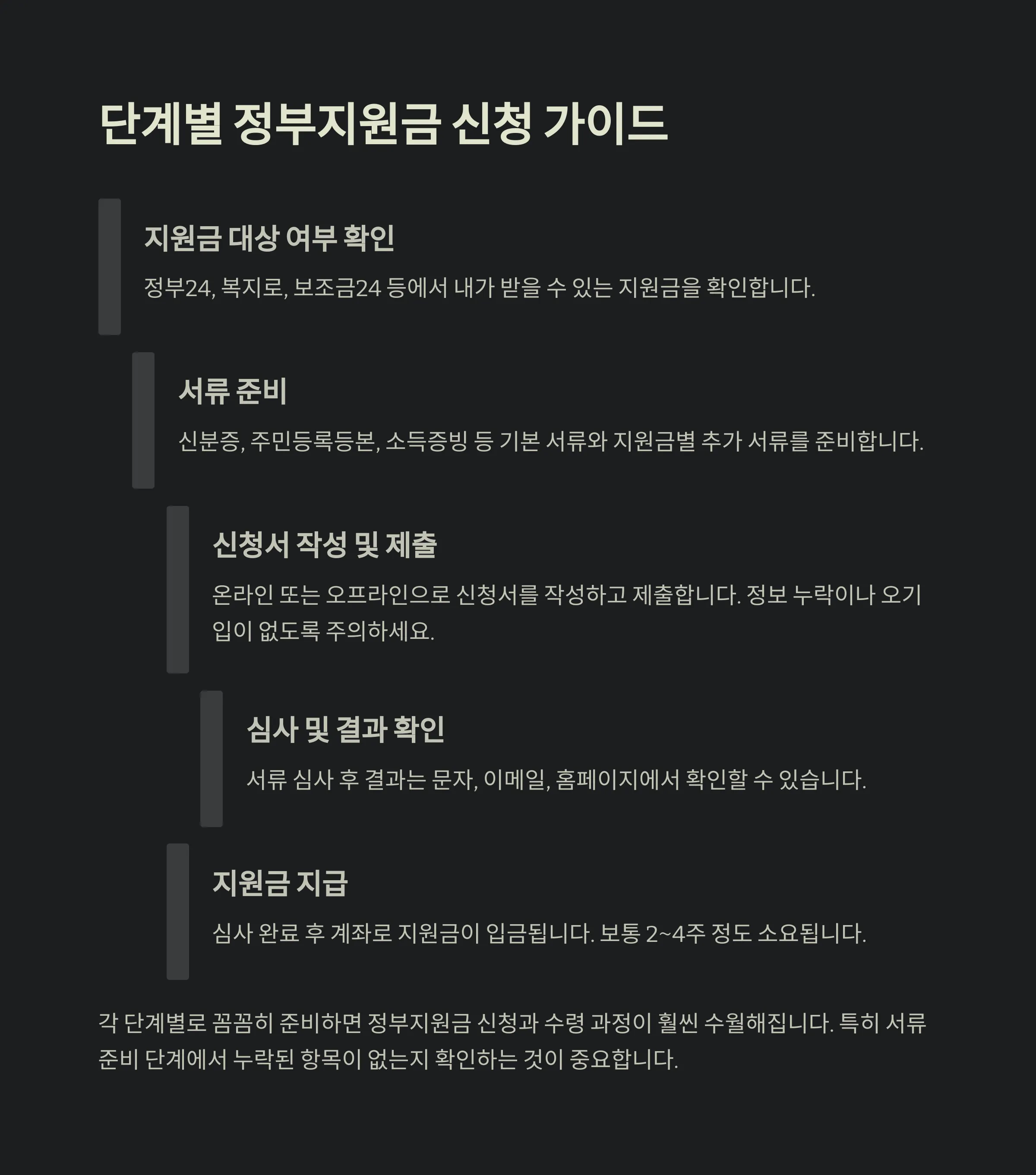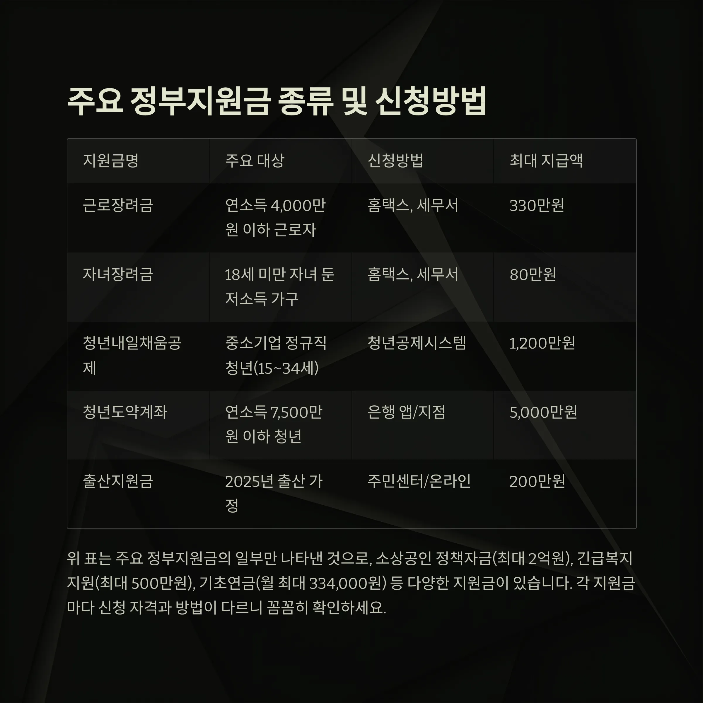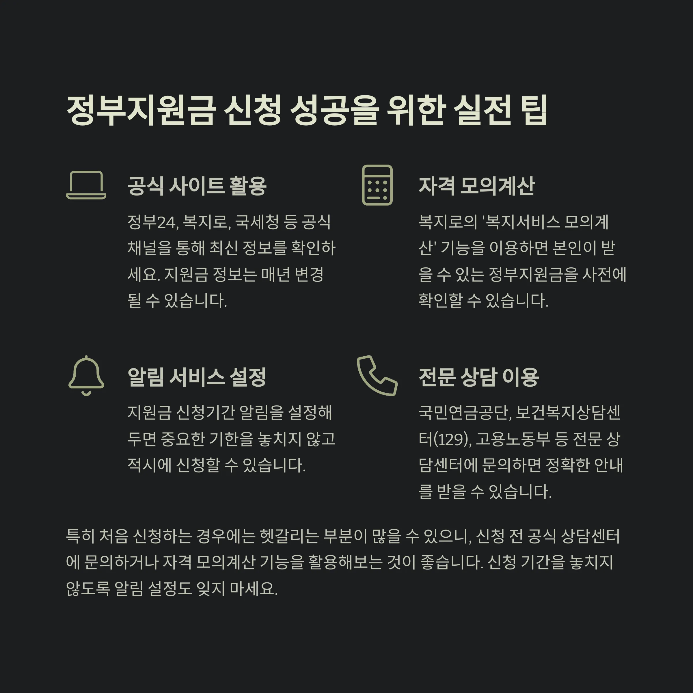 - 공식 사이트에서 최신 정보 확인: 정부지원금 신청방법과 자격, 지급액은 매년 달라질 수 있으니, 정부24, 복지로, 국세청 등 공식 채널을 통해 최신 공지를 확인하세요.