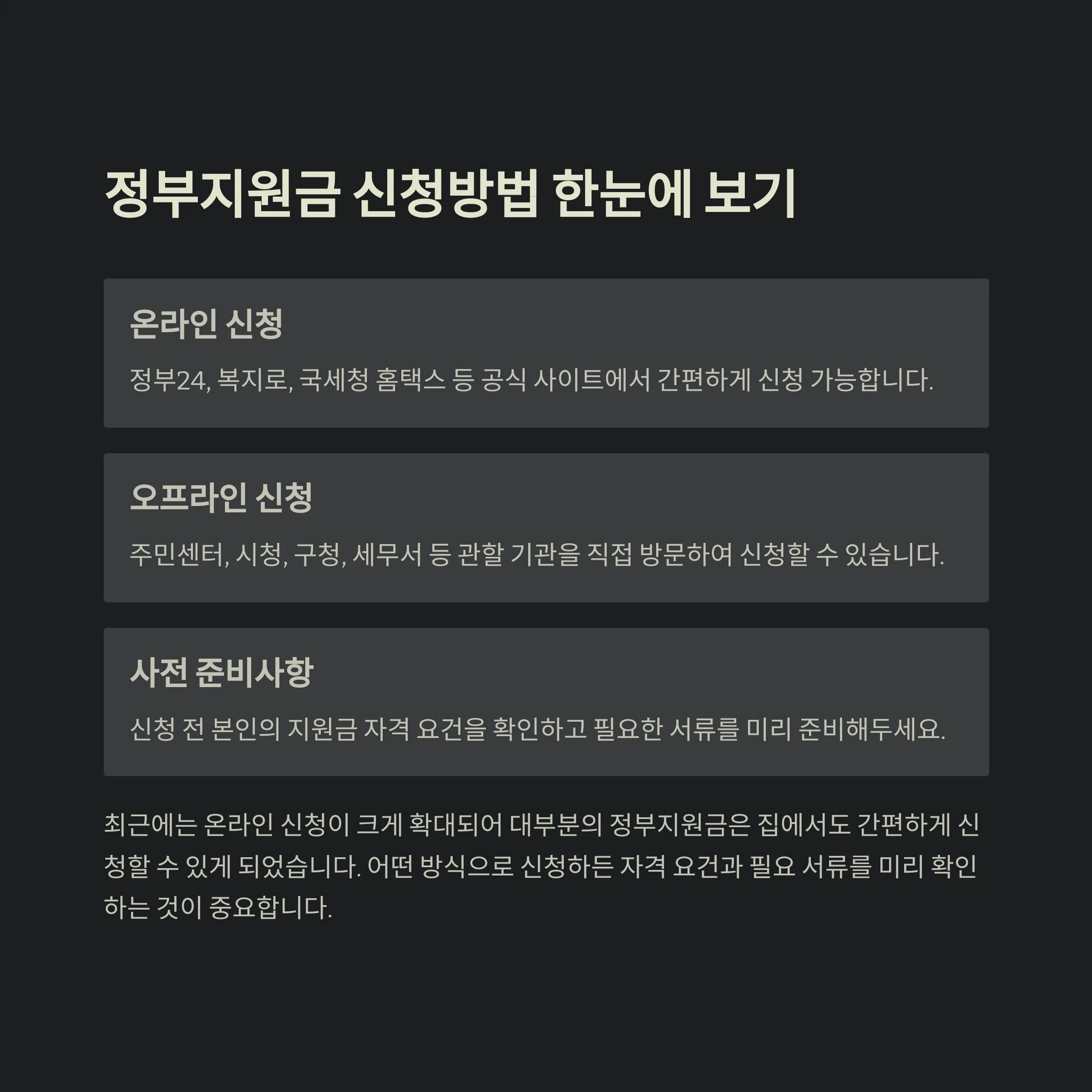 • 온라인 신청: 정부24, 복지로, 국세청 홈택스 등 공식 사이트에서 신청 가능