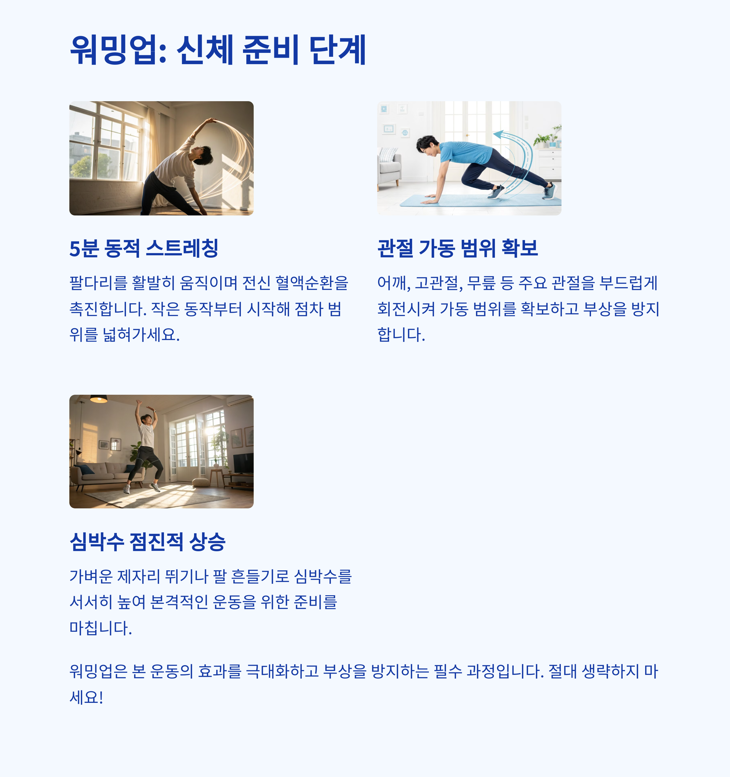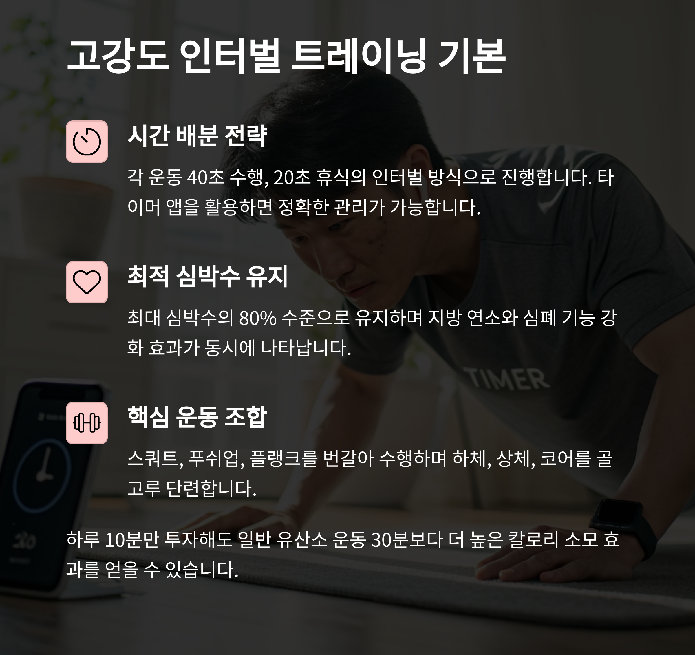 | 워밍업, 전신 운동, 쿨다운으로 구성 | 체력 증가, 스트레스 해소, 체형 개선 | 짧은 시간 집중, 인터벌 활용이 핵심 |