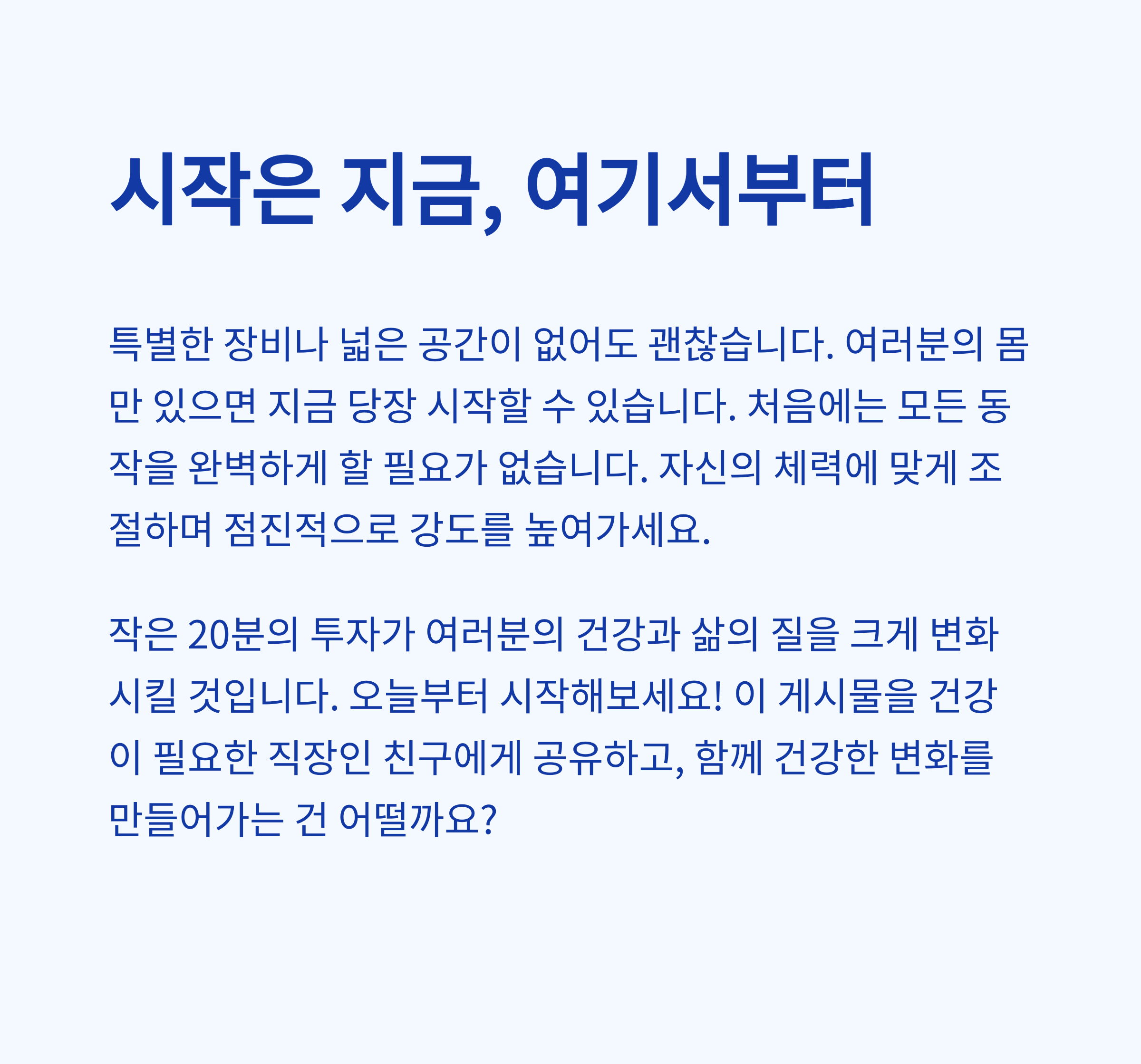 | 운동 시간 | 퇴근 후 단 20분이면 충분합니다 |