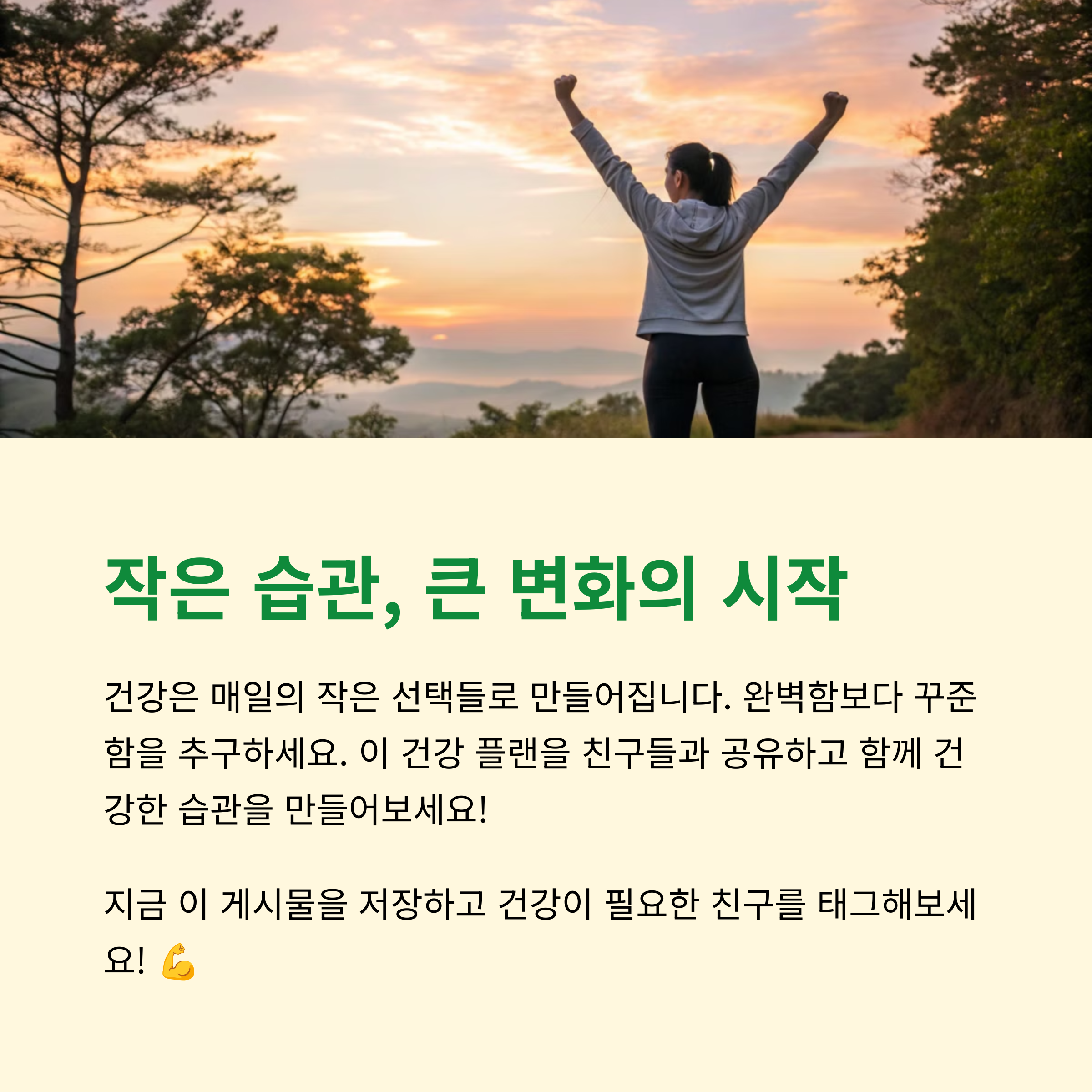 바쁜 일상 속에서도 건강한 생활 습관을 실천하는 것은 결코 어렵지 않습니다. 단지, 작고 꾸준한 변화가 필요할 뿐입니다.