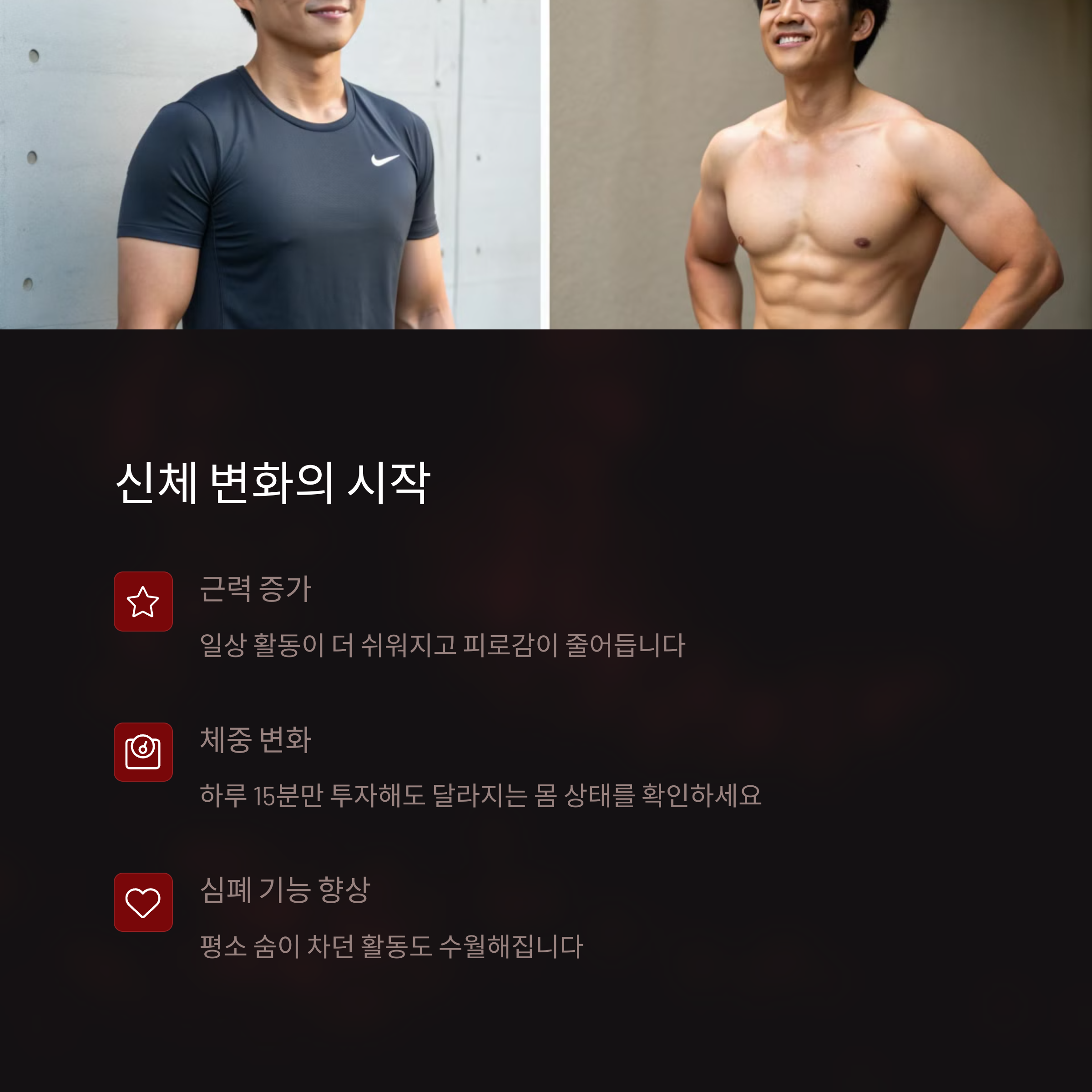 하루 10~20분 꾸준한 도전과 기록의 힘 | 초보자도 쉽게 따라할 수 있는 맞춤형 구성 | 운동을 생활화하며 얻는 지속 가능한 변화 |