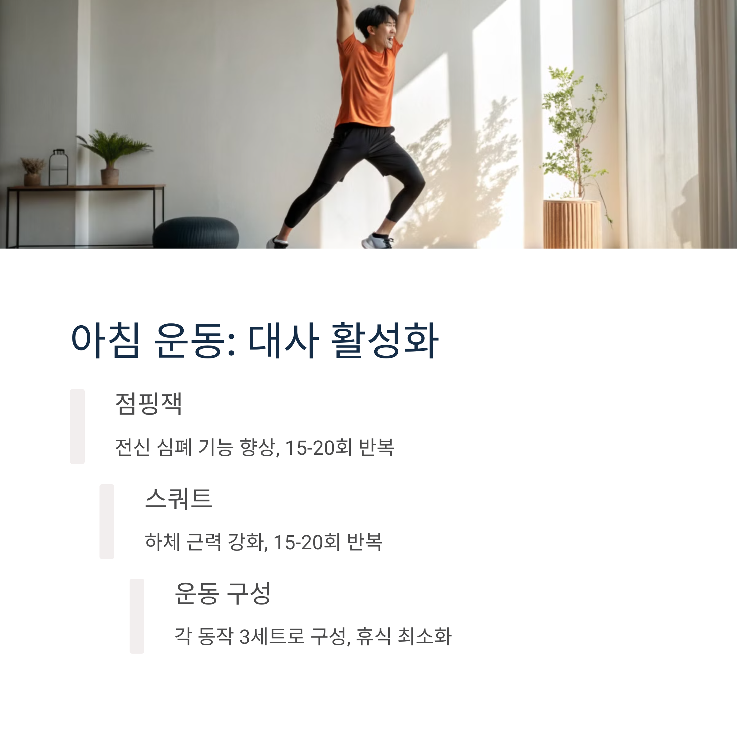 짧은 시간에도 심장 기능 강화에 효과적입니다. 근육을 자극하여 체형 개선과 기초대사량 향상에 기여합니다. 아침, 저녁별로 나누어 실천할 수 있어 지속성이 높습니다.
