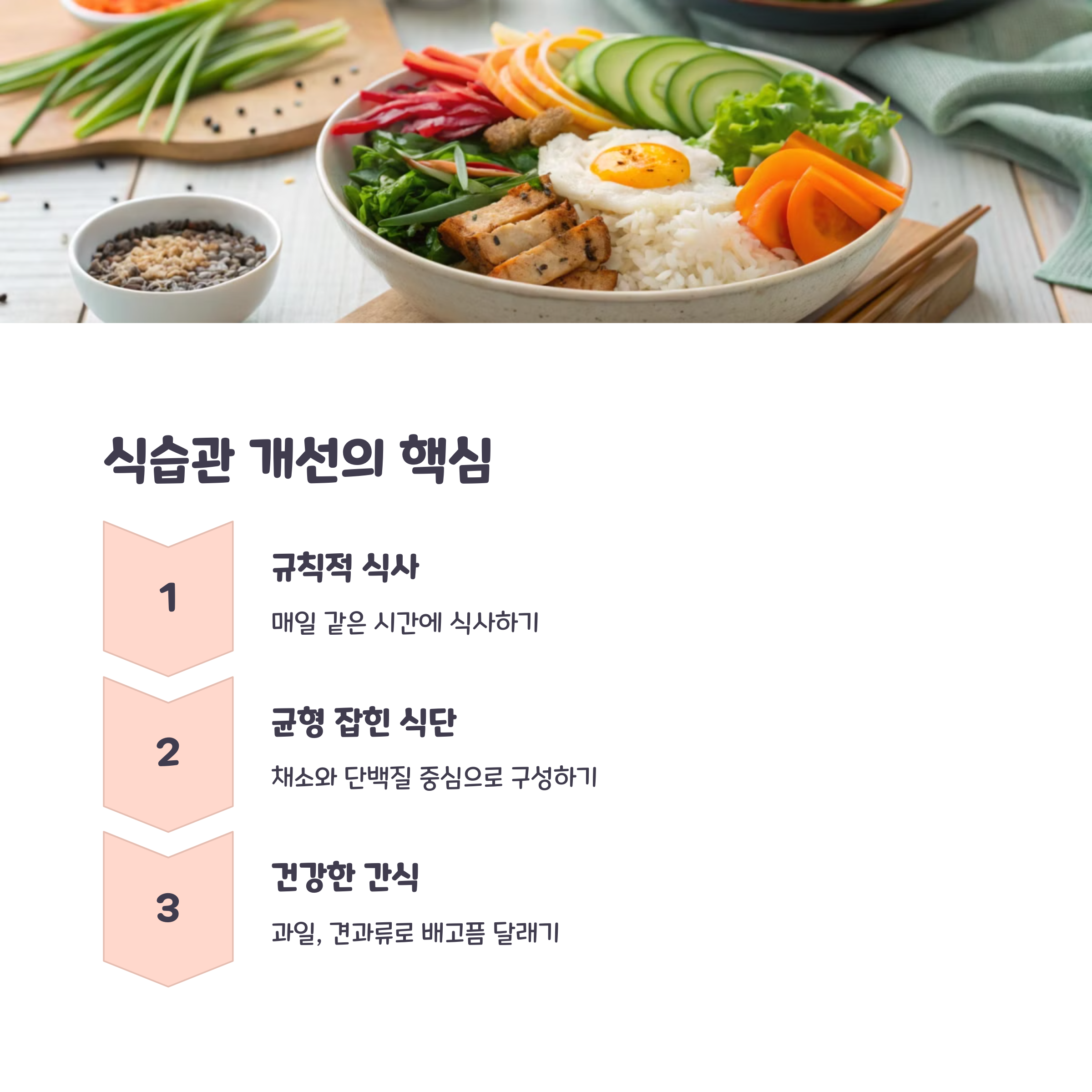매일 같은 시간에 식사하고, 규칙적인 수면을 유지하는 것만으로 몸이 가벼워지는 것을 느낄 수 있었습니다. 특히 정제된 탄수화물보다는 복합 탄수화물 위주로 구성하면서 포만감을 오래 유지할 수 있었습니다.