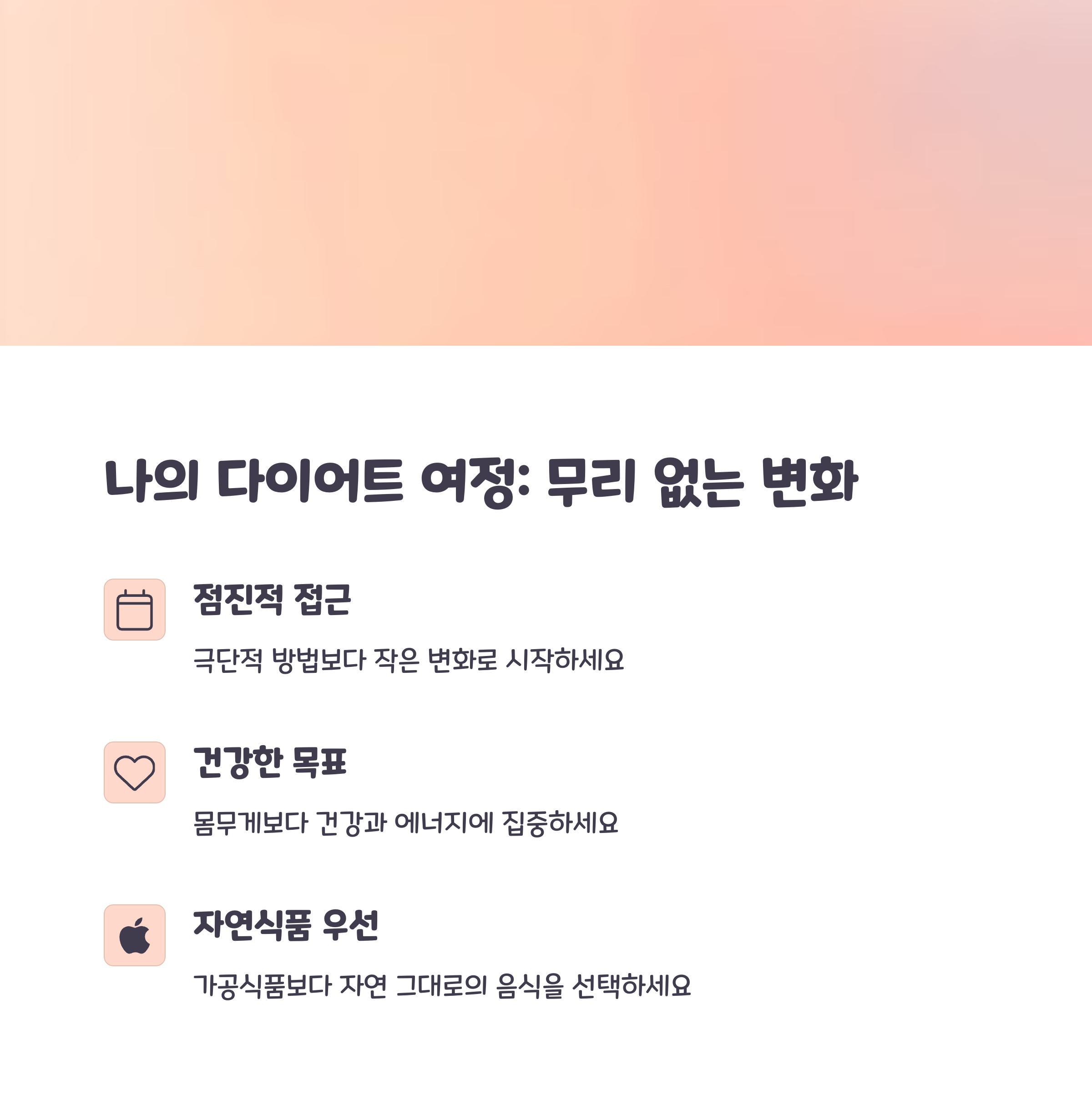 | 하루 세끼 규칙적으로 섭취 | 걷기, 스트레칭, 홈트 영상 활용 | 실패 후에도 포기하지 않는 자세 |