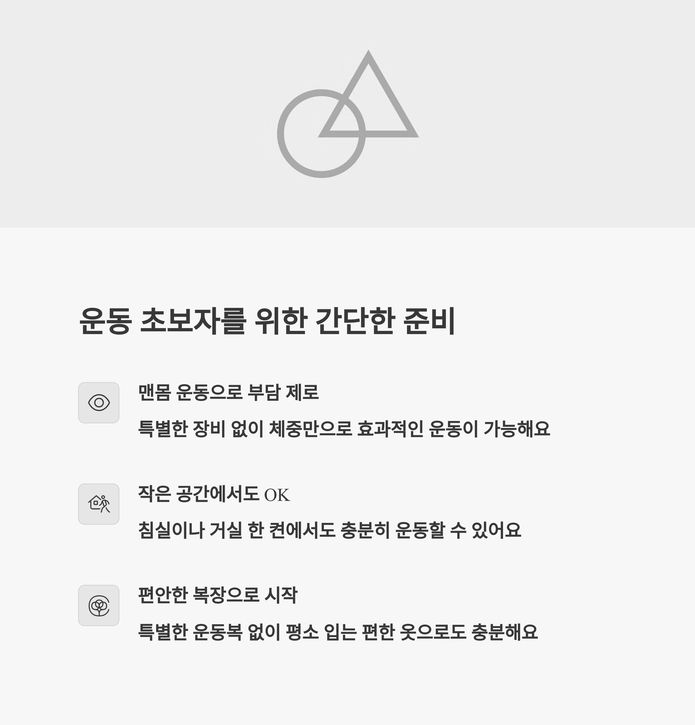 공간이나 시간 제약 없이 가능한 운동 | 자세와 호흡에 집중하는 방식 추천 | 성취감을 통해 꾸준함을 유도 |