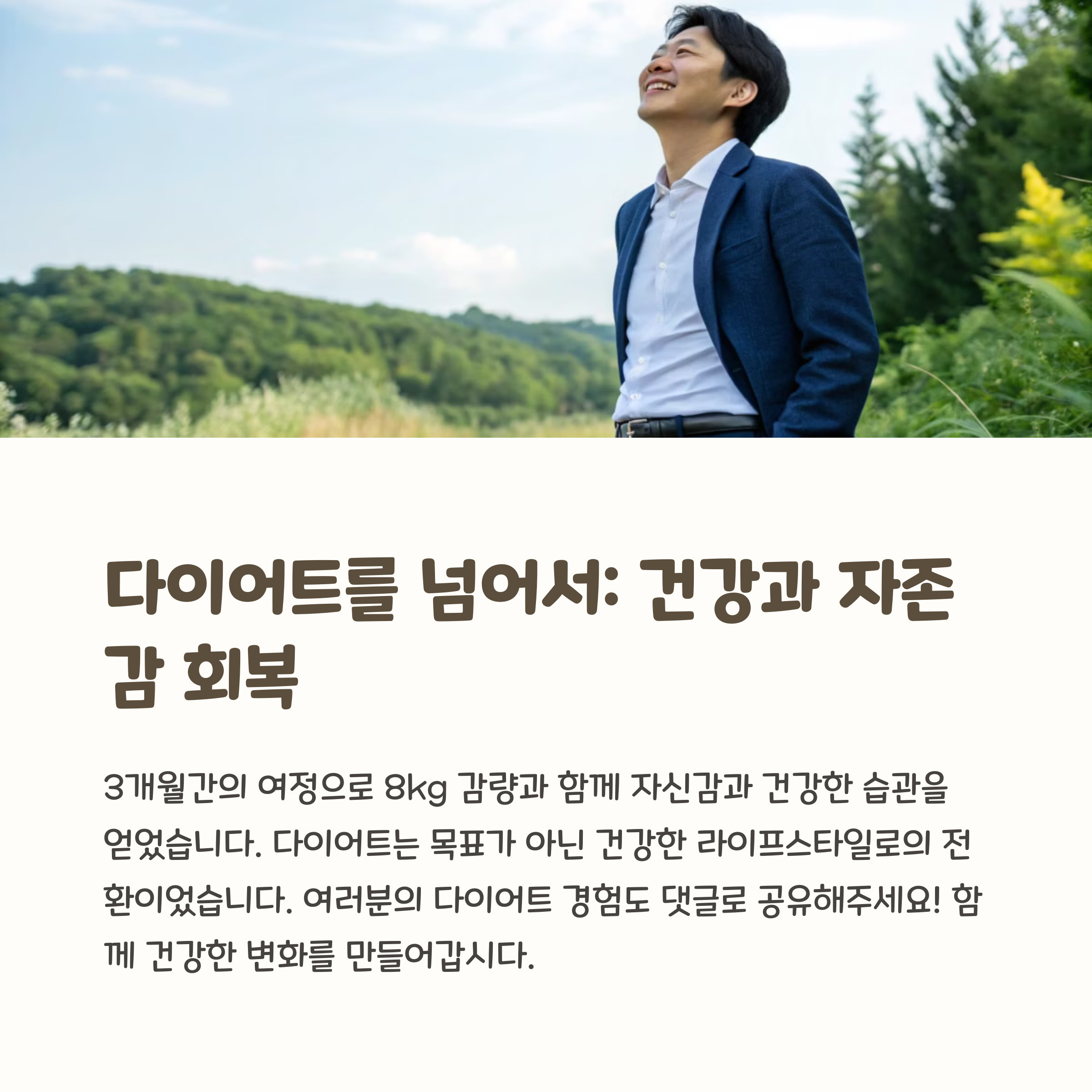 세 번째 달에는 눈에 띄는 변화가 있었습니다. 옷 사이즈가 줄고, 아침 기상도 훨씬 가벼워졌습니다. 특히 주변 사람들의 긍정적인 피드백이 동기를 더욱 높여주었습니다. 결과적으로 총 8kg 감량에 성공했고, 건강 수치 역시 개선되었습니다. 하지만 무엇보다 값진 건 나 자신을 돌보는 방법을 배운 것입니다. 다이어트는 단순한 체중 감량이 아니라, 생활의 태도를 바꾸는 경험이라는 걸 절실히 느꼈습니다.