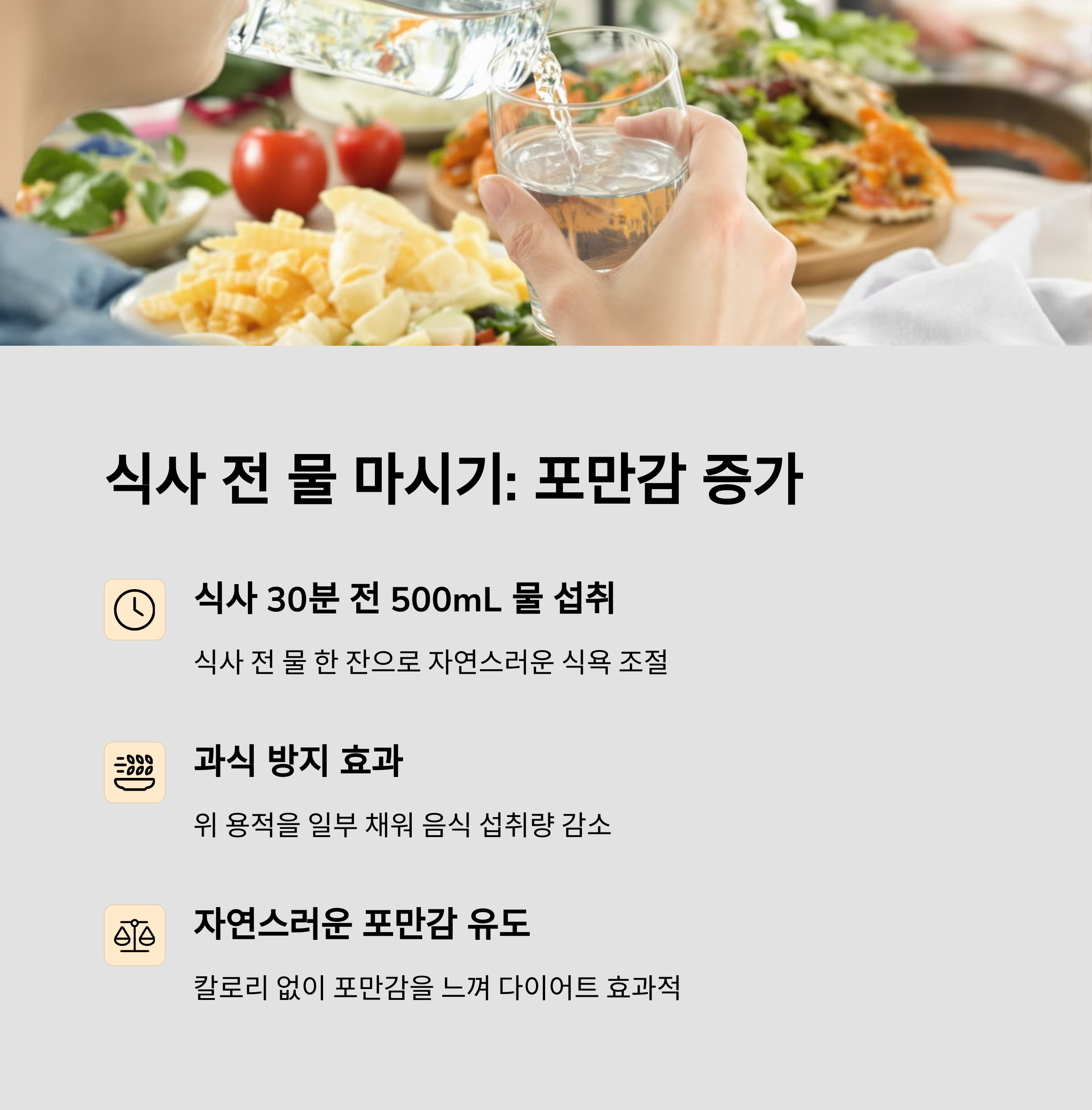 | 식사 전 물 마시기 | 식사량 조절과 포만감 유도에 탁월한 효과가 있습니다. |