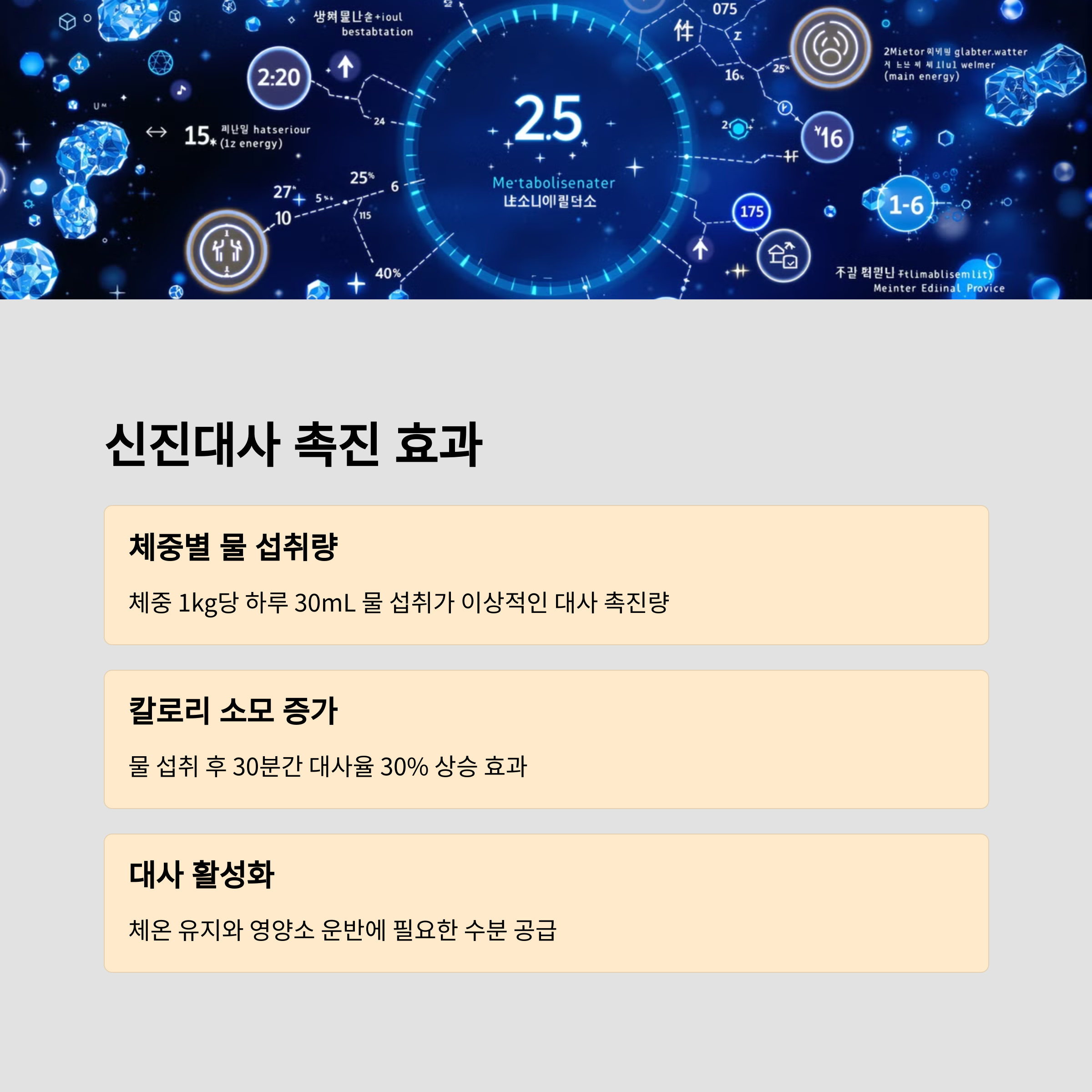 | 신진대사 활성화 | 물 섭취는 일시적으로 대사를 증가시켜 칼로리 소모를 돕습니다. |