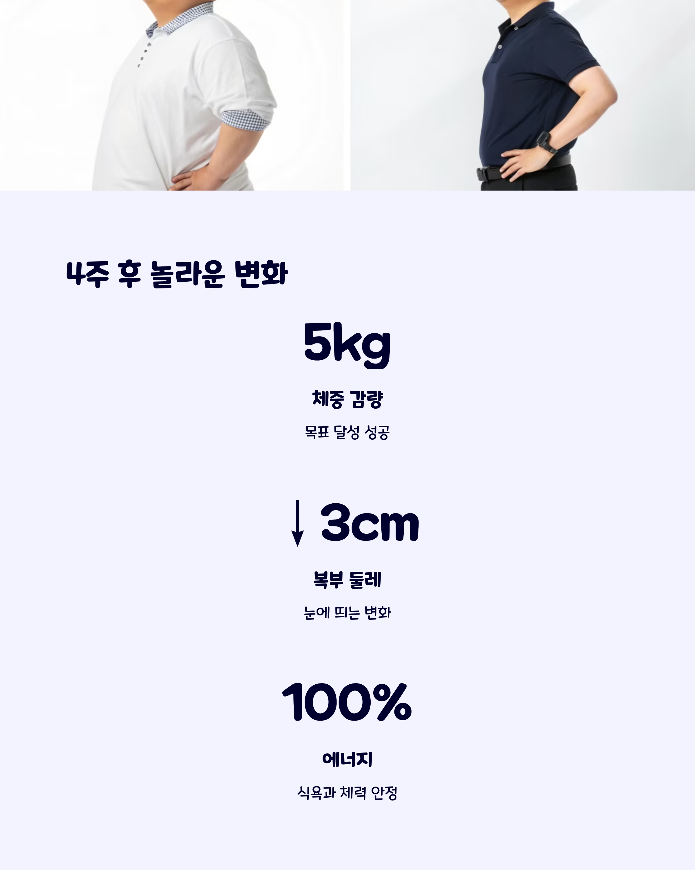 | 체중 감량 효과 | 4주 만에 5kg 이상 감량 효과를 직접 경험했습니다. |