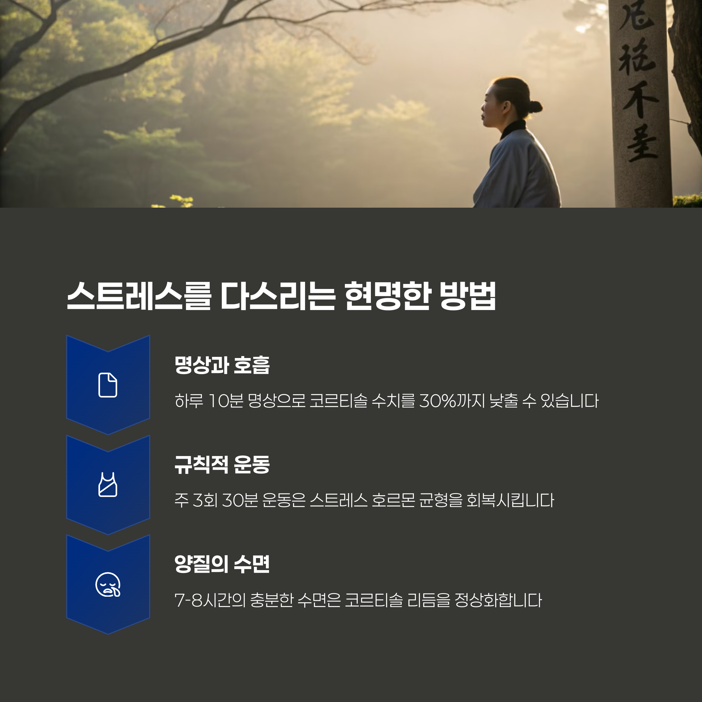 스트레스 시 지방 축적과 체중 증가에 관여 | 불안한 감정을 음식으로 해소하려는 행동 | 명상, 심호흡 등 일상 속 긴장 해소법 실천 |