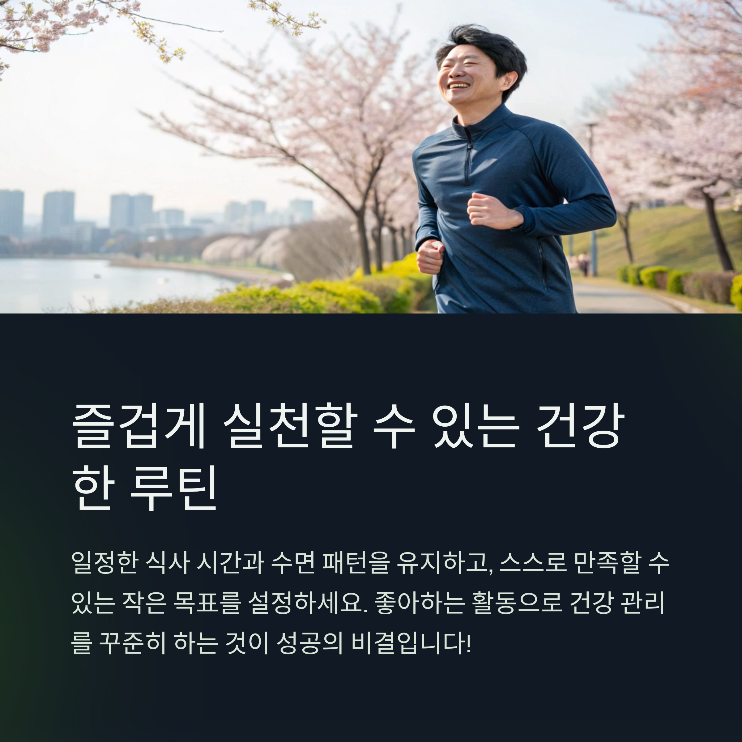| 꾸준한 운동 | 강도는 낮춰도 지속적으로 운동하는 것이 핵심입니다. |