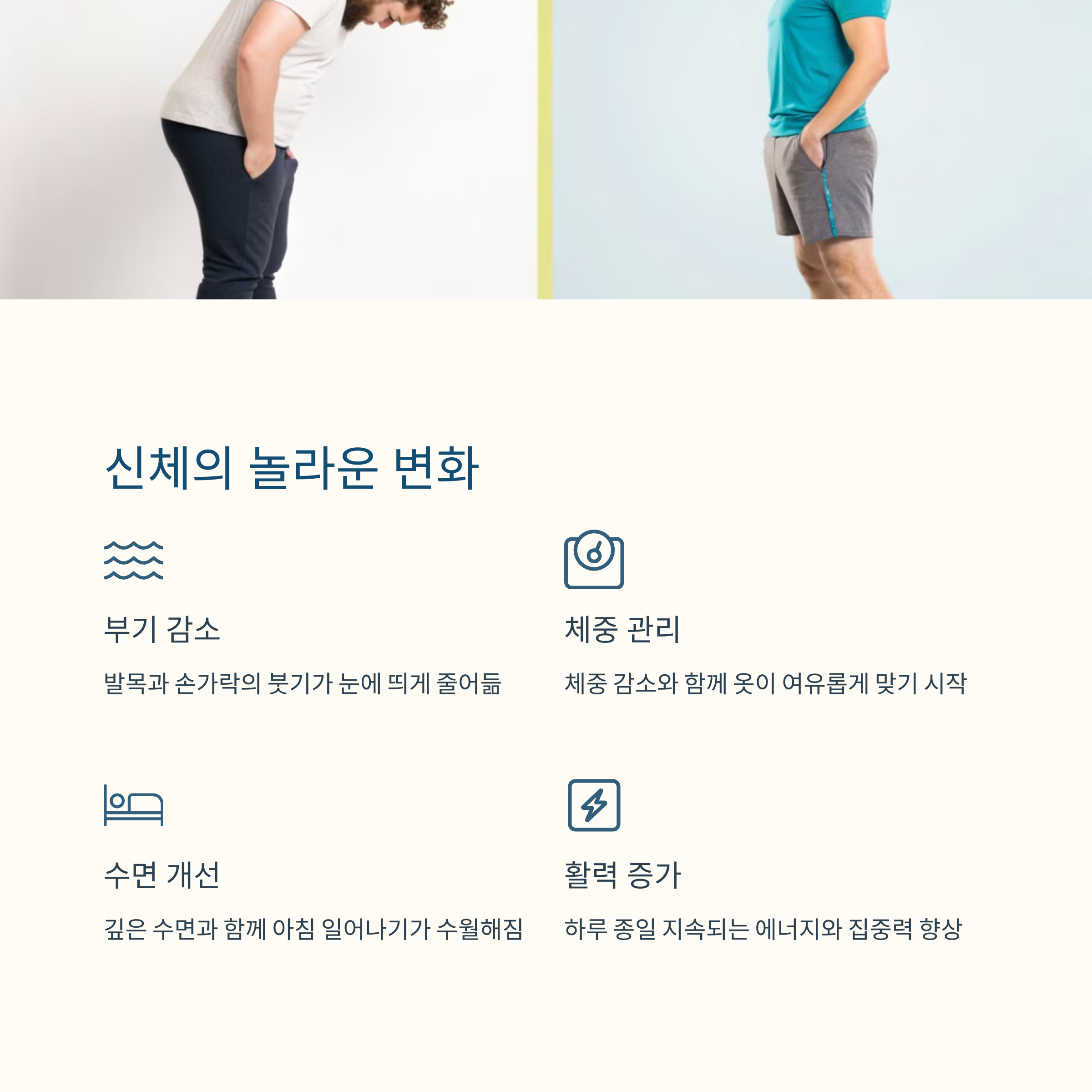 둘째 주가 되면서 눈에 띄게 몸의 반응이 달라졌습니다. 아침에 일어날 때 몸이 가볍고, 식욕 조절이 잘 되는 느낌도 있었죠. 특히 복부 부기와 불편함이 줄었고, 걷고 난 날 밤에는 숙면도 가능했습니다. 정신적인 부분에서도 변화가 있었는데요. 단순 반복 운동이지만 집중력이 좋아지고 생각 정리에도 큰 도움이 되었습니다.