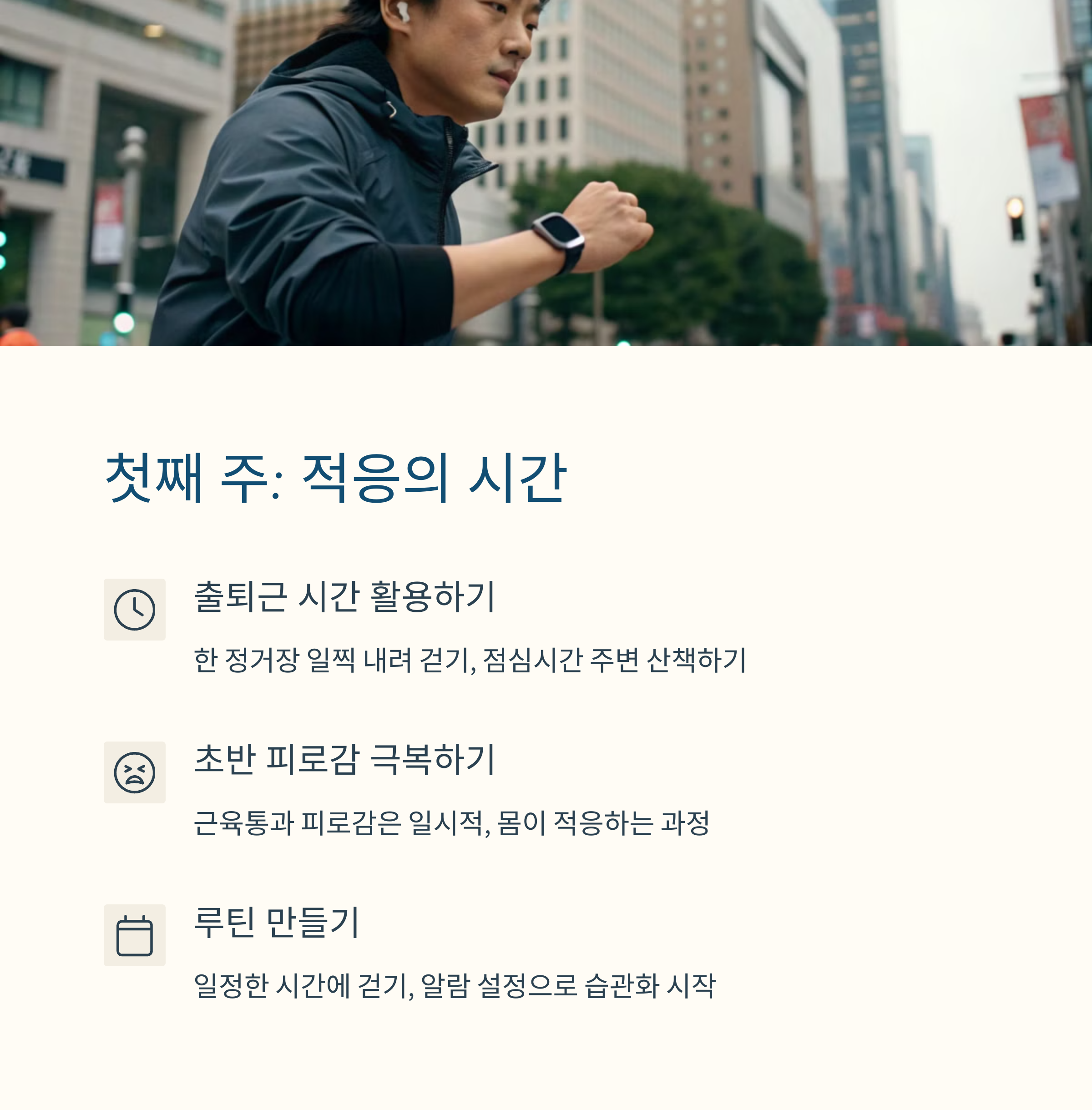 첫째 주에는 적응 단계가 필요했습니다. 처음에는 생각보다 쉽지 않았어요. 매일 1만 보를 걷는다는 건 의외로 많은 시간과 계획이 필요하다는 걸 느꼈습니다. 출퇴근 시간, 점심시간, 퇴근 후 산책 등 일상을 걷기로 재편해야 했죠. 하지만 3일 정도가 지나자 발과 다리가 점점 적응했고, 이후엔 걷는 시간이 오히려 스트레스 해소 시간이 되었답니다.