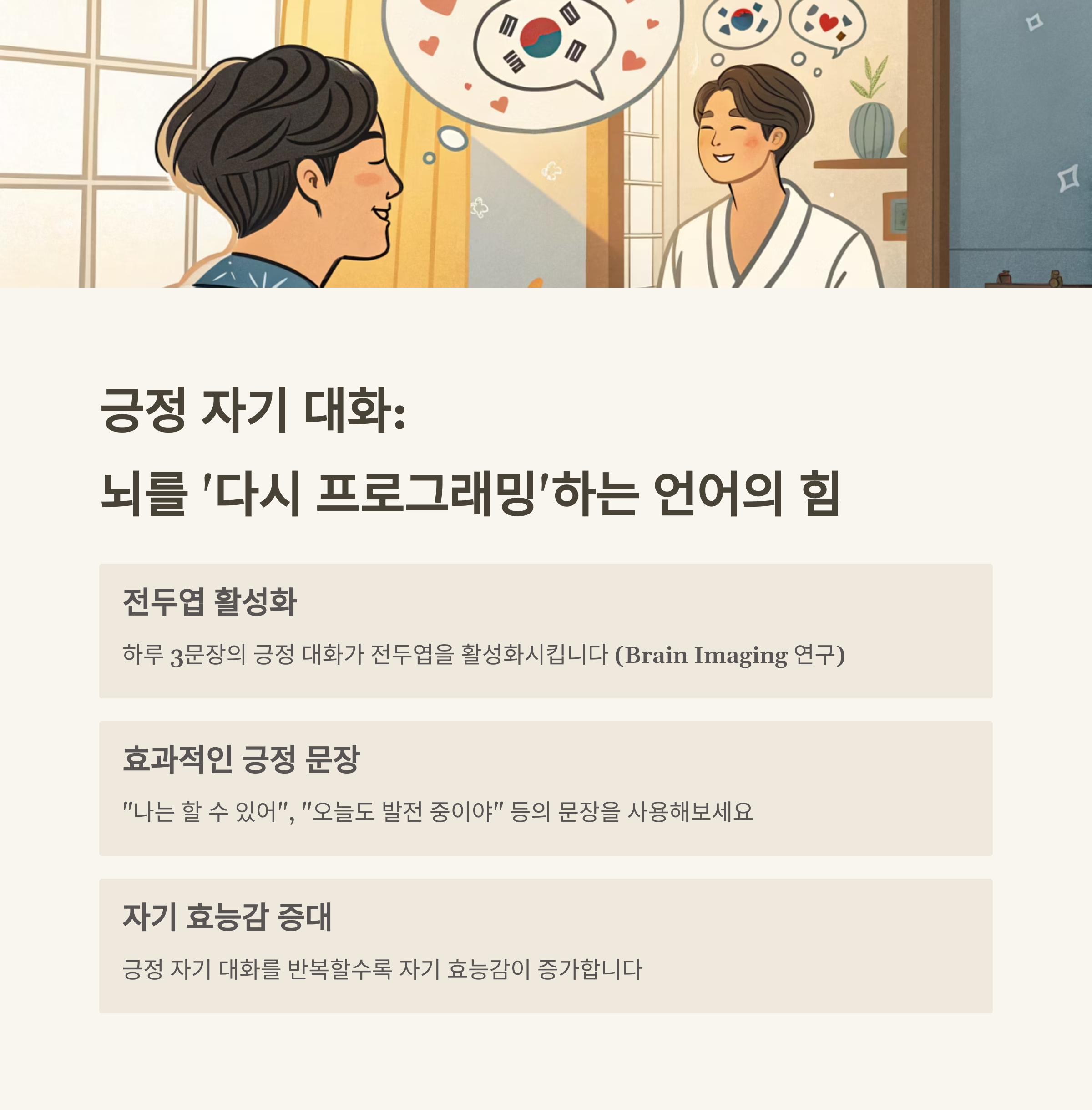긍정 자기 대화는 뇌의 인지 패턴을 바꾸는 강력한 도구입니다.