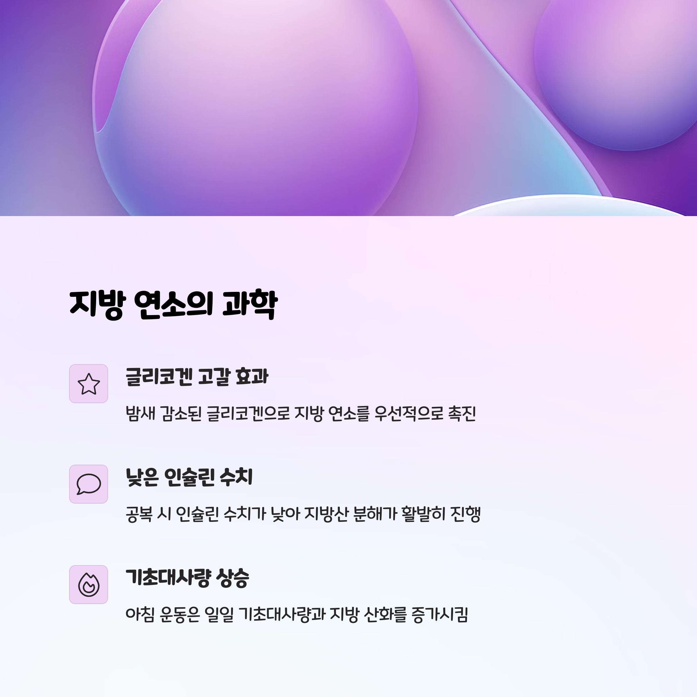 공복 유산소 운동은 이 호르몬들의 작용을 극대화하여 체지방 감량을 가속화합니다.