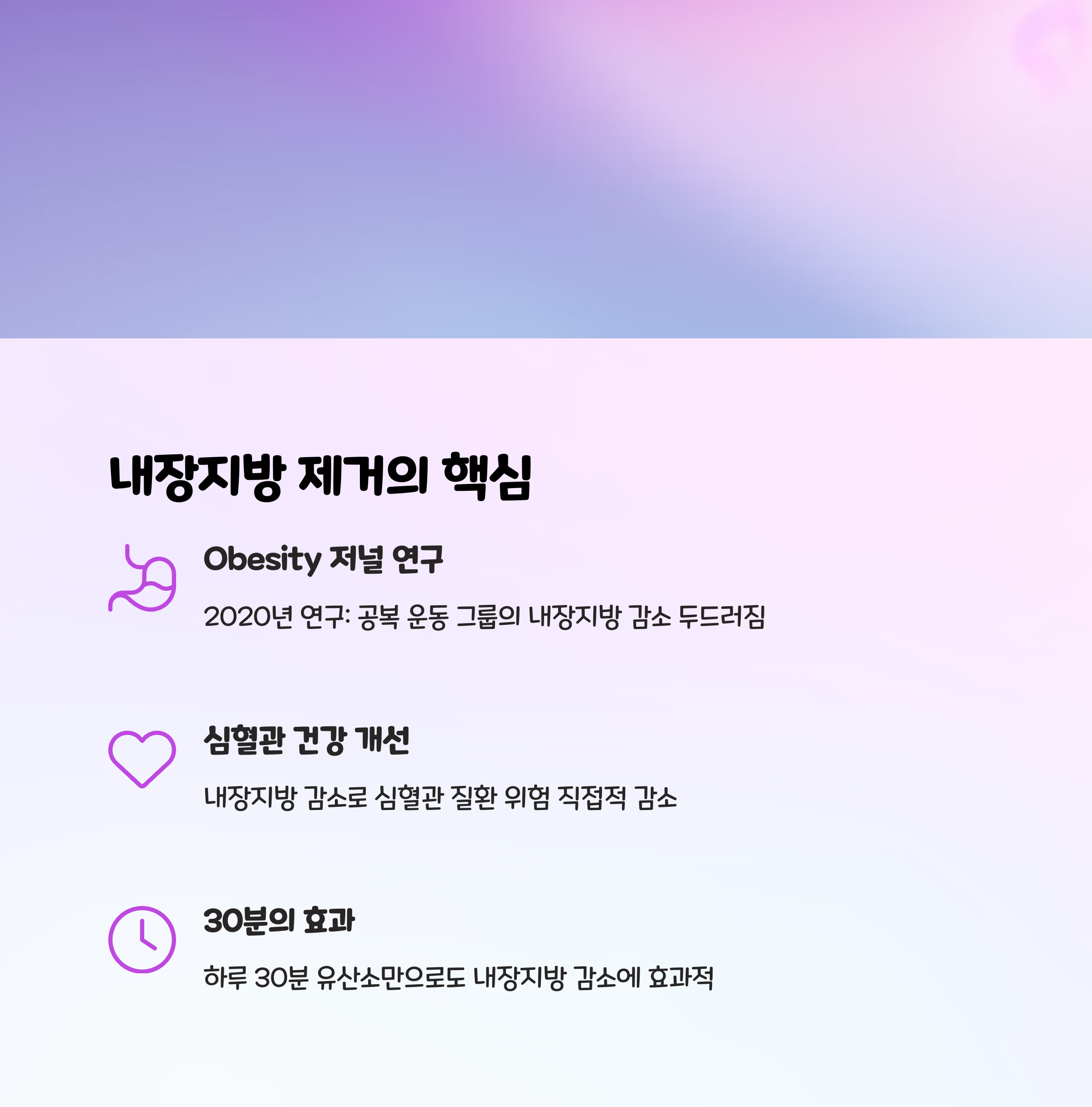 아침 공복 운동은 내장지방을 줄이는 데 특히 효과적입니다.