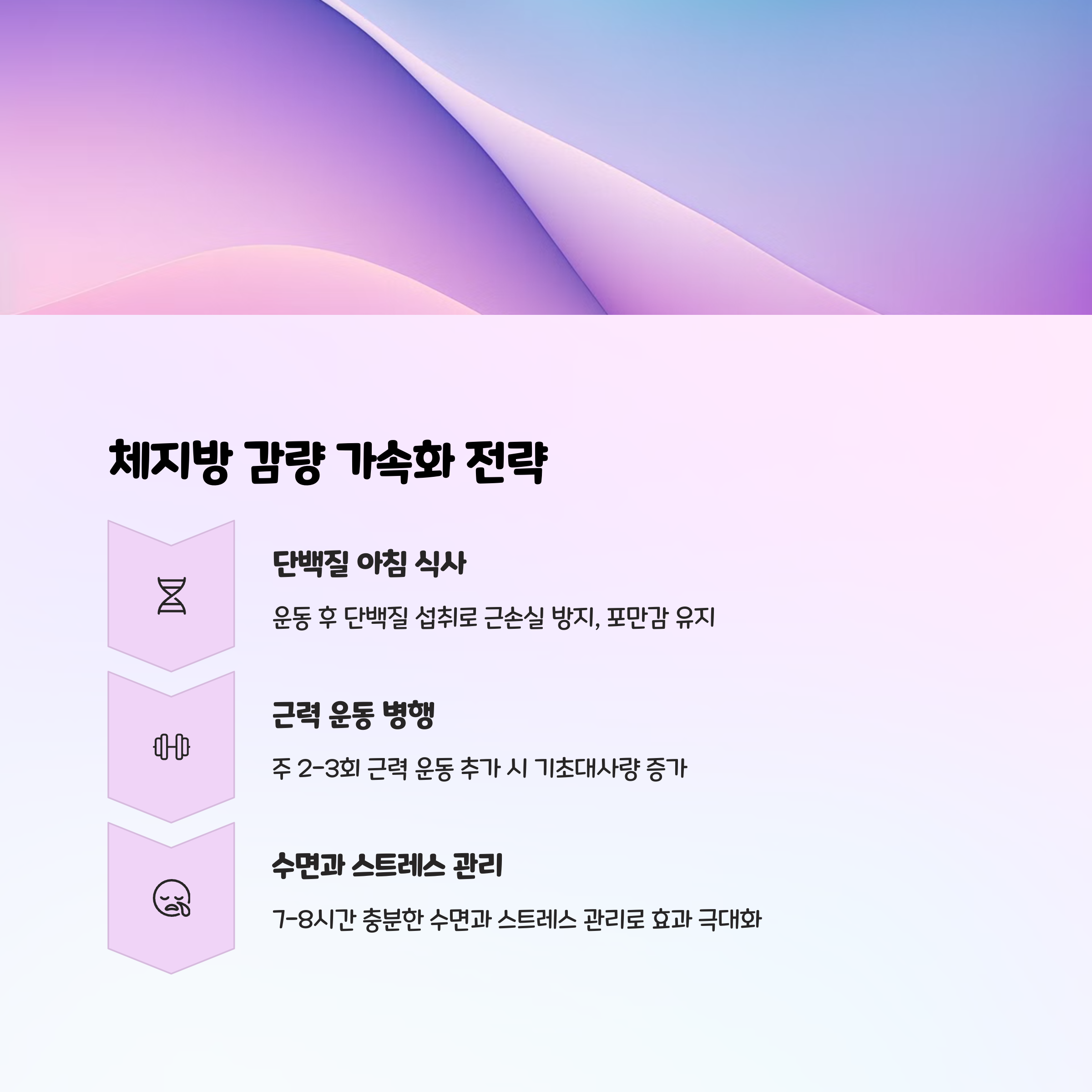 이러한 요소들을 함께 관리하면 체지방 감량 속도가 눈에 띄게 빨라집니다.