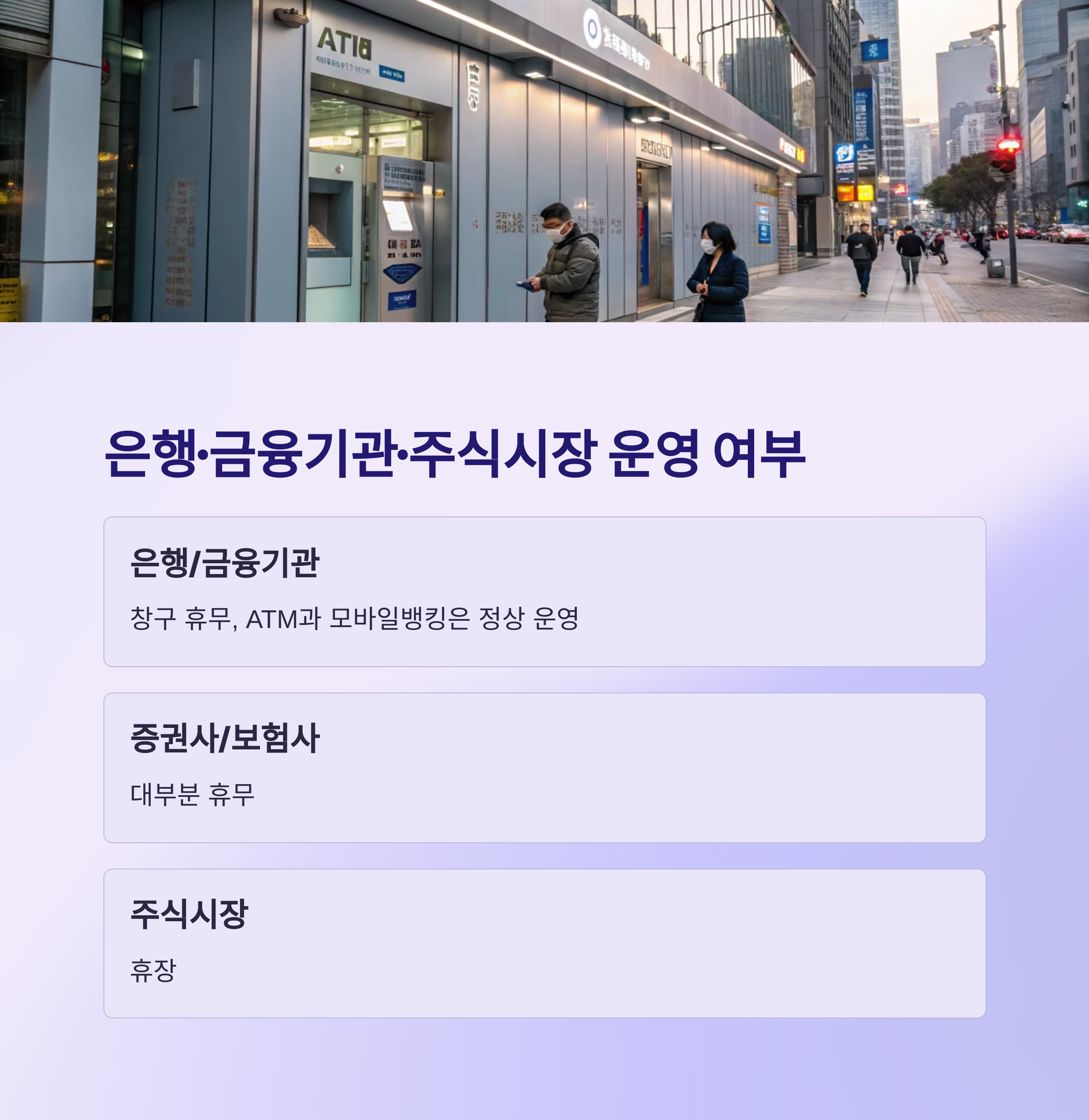 | 은행/금융기관 | 창구 휴무 | ATM, 모바일뱅킹은 정상 운영 |