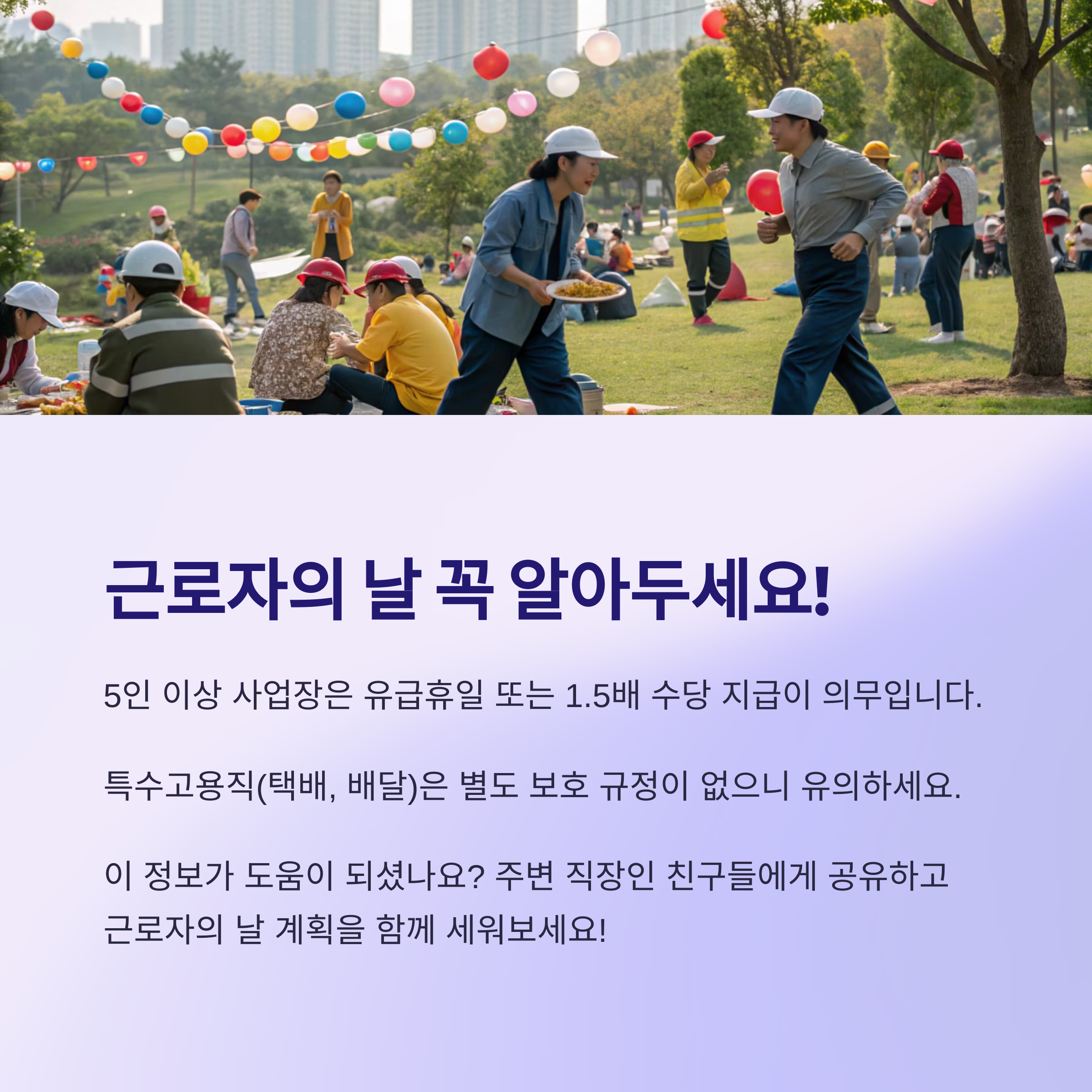 "근로기준법 적용 사업장(5인 이상)에서는 근로자의 날을 유급휴일로 보장합니다."