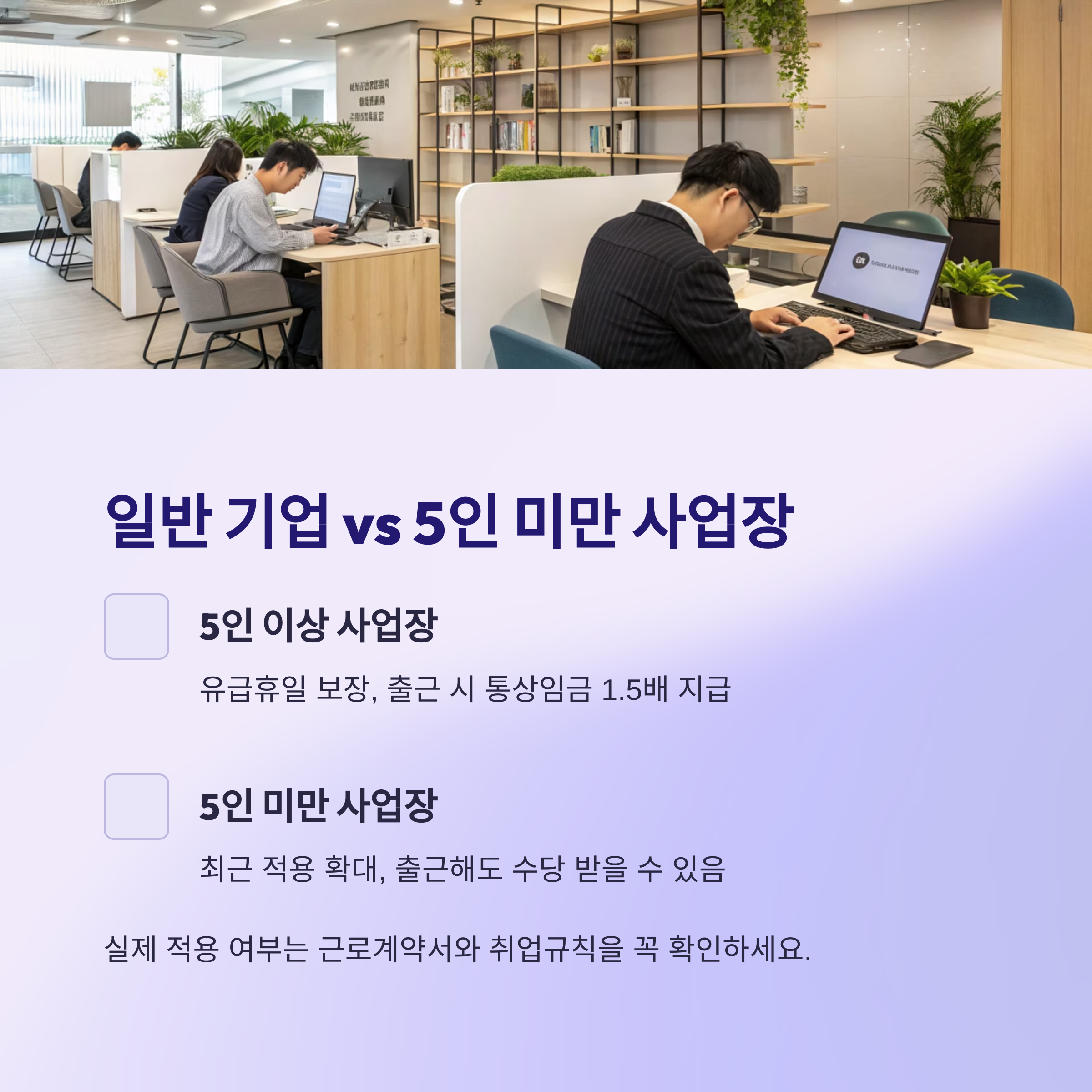 - 5인 미만 사업장: 최근 적용 확대, 출근해도 수당 받을 수 있음