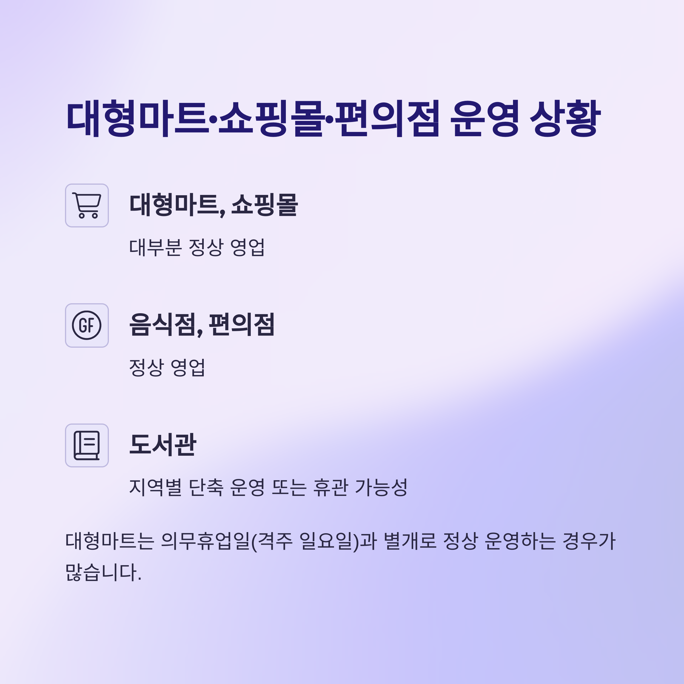 - 대형마트, 쇼핑몰: 대부분 정상 영업