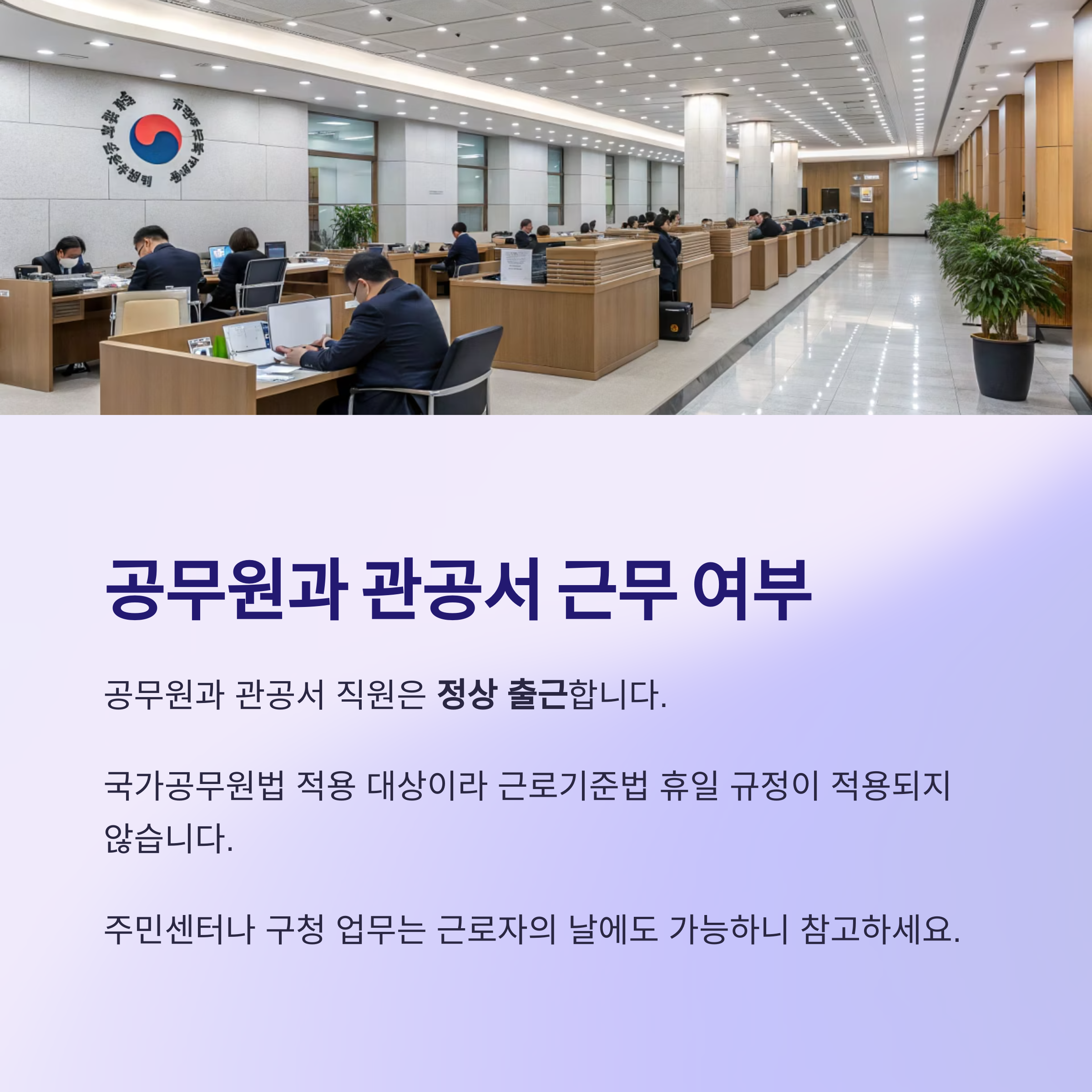 - 국가공무원법 적용 대상이라 근로기준법 휴일 규정이 적용되지 않습니다.